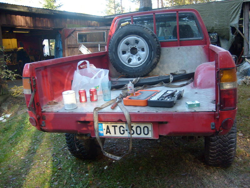 RatTaroEli tuli tossa aloitettua jokin aika sitten tämmönen pikkunen "käyttis" rojekti, jota tehdään mahdollisimman pienellä budjetilla ja pikkuhiljaa...Tarkoitus on myös ajaa metässä...TOTTAKAI! ![]() Eli tarkoitus on ollut ehostaa autoa vähän joka tavalla... ![]() Lähtökohtana tällainen ruotsin tuonti Vw taro/hilux 2.2 bensakoneella.. (Ihan eka homma oli maalata tuo mielestäni ruma harmaa maski+ logo jne.. mustaksi .) Autoon tehtiin ensin jarru-remppaa ja muutakin alustaan liittyvää (helmojen hitsaamista jne..) ja leima tuli lopulta viime keväänä n.vuoden seisonnan jälkeen... tältä näytti satula(t) ennen uusien vaihtamista: Suojakumi heikossa hapessa... Rälläkkää ei myöskään säästelty...