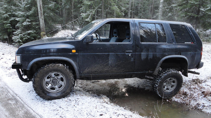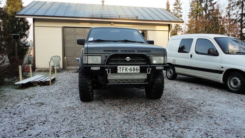 Eli tällä hetkellä alla 31" renkaat. Myöhemmiin tulossa 33" renkaat, kunhan saan jostaki ostettua korjausoppaan jolla sitten saa isommat rekisteriotteeseen. Koria nostettu 75mm. Ja taakse on tulossa +75mm korottavat jouset joulun jälkeen. Viime viikolla askartelin myös tukevamman etupuskurin, 4mm U palkista. Takapuskuri täytyy laittaa sit keväällä kun kelit lämpenee taas.