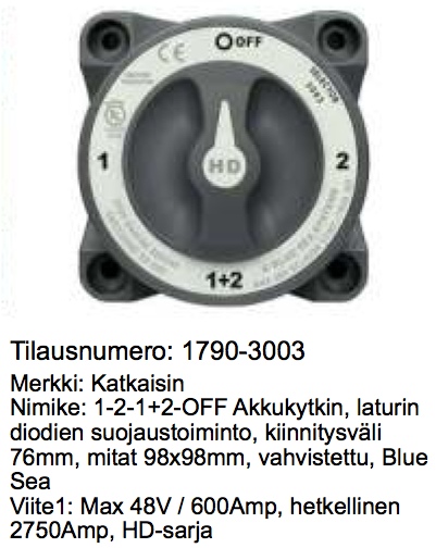 Motonetistä samanlainen päävirtakytkin edullisemmin... löytyy veneosastolta. Mulla semmonen keskikonsolissa. Kestää virtoja ja saa vaikka molemmat vinssit käyttöön jos haluaa venyttää autoa 75 neliöisillä kaapeleilla tuntunu 9,5 comeupeille virta riittävän eteen ja taakse pajeron mittasessa autossa. Mukava mahollisissa oikosulkutilanteissan tai releboksihäiriöissä kun päävirtakytkin on vieressä.. vääntää vaan virrat pois ja tutkii ongelman aiheuttajan kuntoon (tullee monesti halavemmaksi).