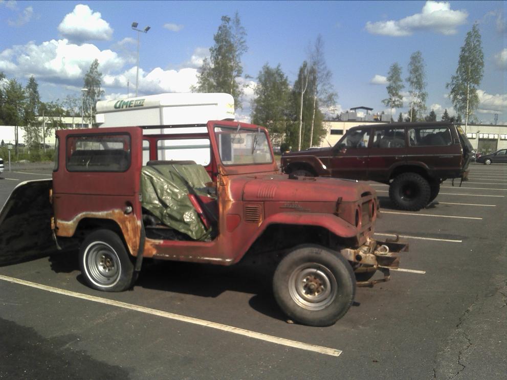Toi on TOSI vanha FJ40. Toi on jotain 60-luvun lopun tai 70-luvun alku. Ois oikestaan ihan entistämisen arvonen. Huomion herätti melko hyvä kuntonen kori ja lokasuojat.