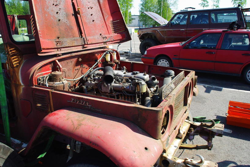 Toyota Land Cruiser Bj-40Moro kaikille Uutta projektia puskee päälle vanhojen hävittyä. Käytiin keskiviikkona hakemassa bj:n aihio ja todettiin, että kai tästä nyt jotain tulee. Auton iästä ei vielä ole tietoa, paperit tulee myöhemmin. Aika vanha bj vissiin on, koska pyyhkijät on ylhäältä kiinni ja polttoainetankki sijaitsee apparin penkin alla. Autosta puuttui moottori ja laatikot sekä ovet menevät kaverille. Runko on puhallettu ja maalattu jokinen vuosi sitten, joten sitä ei tarvitse ruveta hitsaamaan. Suurimmat hitsaustyöt on auton takakulmat. Auto tulee kokemaan aikamoisia muutoksia. Tässä listattuna mitä ainakin tehdään Hj 60:n kone hj 61:n laatikot Hj lukkoakselit Kierrejousitus molempiin päihin Korista puretaan katto ja ylemmät sivut pois --> tilalle turvakaaret ja niiden päälle jonkinlainen pressu Helmapalkit ja puskurit Safarivarusteet (tunkit, kompurat yms.) Kuvat on kivoja niin laitetaan tähän jotakin. Kuvat ei oo maailman parhaita kun on otettu kännykällä, mutta seuraavalla kerralla parempi kamera mukaan. Taustalla näkyy myös räppi laitos. HJ-60. Huomenna homma jatkuu nostamalla korin pois ja rupeamalla sovittelemaan konetta paikoilleen. Onko tietoa miten hyvin toi 2H kone siihen mahtuu? Luulisin, että käy paikolleen ilman hirveitä laikotuksia, koska sen tiedän, että joku kuusi sylinterinen bensa kone siinä on ollut kiinni. Heittäkää ihmeessä ideoita jos hyviä sellaisia tulee, sekä tietystä palautetta.