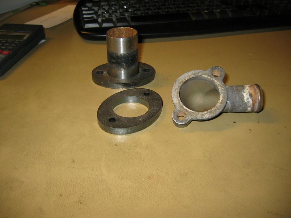 Kuten Juuso kertoi ei ole vielä hitsattu kasaan. Tässä kuitenkin pari kuvaa osasta. Teräksestä leikattu kaksi laippaa ja putki väliin. Näillä saa letkulähdön käännettyä sopivaan asentoon. Ylempään laippaan tulee M8 kiertet ja termostaatti tulee laipan ja alkuperäisen kotelon väliin.