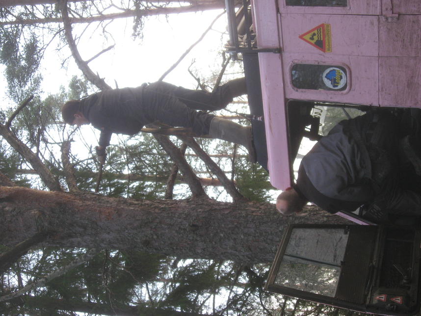 Laitetaas jotain matkastooria ja kaikki yhteen putkeen. Keskiviikkona lähdettiin matkaan Jannen kanssa joskus klo 16 jälkeen. Ajeltiin Vaalimaalle rajahoviin jossa treffattiin Joppa ja Offroadjouni. Muut olivat menneet yli jo aikaisemmin. Sitten alkoikin tulla kiire kun peloteltiin että virvokkeita ei saa paikallisista kaupoista virallisesti enään klo 22 jälkeen. Ei edes mietoja. No melkein kaikki ehti siiheksi rajasta yli paitsi Joppa jolla oli pientä paperisotaa viranomaisten kanssa. Viipurin veikoista viimeiset ostokset ja sitten suopuomille tankkaamaan. Puomilta lähdettiin kohtuu tarkkaan puolen yön jälkeen liikeelle kohti Metsäpirttiä. Jopalle maxilastaus suopuomilla kun tuntuu uudet sawit kantavan hyvin kuormaa. Pitkälle ei päästy kun wrangleri alkoi voblailemaan aika rajusti. Pysähdyttiin nesteelle täyttämään eturenkaat josko se hieman auttaisi. Yksi ongelman aiheuttaja tuntui olevan pyörän laakeri jossa oli jo klappia. Laitettiinkin Suomeen viestiä Kaken porukalle että yrittää etsiä laakerin kun olivat tulossa vasta torstai iltana.Pahalta näytti heti alkuunsa. Kuitenkin laakeri ei kuumentunut ja ilmeni että osa väljistä johtuu ilmeisesti kuluneista uniball nivelistä. Matka metsäpirttiin sujui rivakasti koska tiet olivat käsittämättömän hyvässä kunnossa melkein perille asti. Räkytäkyllä ajo Viipurin ohitiellä oli lähes hengenvaarallista kun jostain väljistä yms. ongelmista johtuen ohjaus tempoi laidasta laitaan. Varsinkin ohitustilanteissa ei meinannu kaistat riittää. Väihköstä myönsi että oikeen pelotti olla kyydissä. Takaiskarit oli myös ihan loppu ja metsäpirtistä ekaan leiriin ajettu kuoppa/nimismiehen kihara tie oli aika tuskaa takapään hakatessa kokoajan pohjaan. Metsäpirtin alapuolella olevaan leiriin saavuttiin joskus aamuyöstä kuvien aikaleimoista päätellen 3 ja 4 välillä. Joen ylitys jossa oli ollut kaunis jalan kuljettava silta oli muuttunut isoksi tukkirekalla ajettavaksi sillaksi. Onneksi sillä vesi oli niin korkealla että ylittäminen olisi ollut melko mahdotonta tai ainakin järjetöntä. Leirissä oli jo muu porukka mutta tulet oli olemattomat kun koittivat märkää puuta polttaa. Uglyllä oli sentään niin paljon intoa että kävi kelon hakemassa mutta sitä ennen sai palella. Tuntui että yö oli kylmin koko reissulla. ekan leirin tulilla Ilkka sahaa märkää pölliä lopulta saatiin makkaranpaisto nuotio aikaan Ugly ottaa rennosti Aamulla tehtiin ensimmäiset huollot kalustoon kun uglyHJ sai norran solmuun öisellä kelon haku reissulla. Jari viilaili sahoja kuntoon muunmuassa rälläköimällä purupiikkejä parempaan kuosiin. Täällä oli menossa melkoiset puutalkoot ja isoa kalustoa valui lumisuon suuntaan. Toisissa autoissa apukuskien viihtyvyys oli optimoitu. Läppärillä oli näytössä kamera josta näki kulkusuuntaan kun ei tuolta muuten näe ulos mitään. Matka muutaman kilometrin päähän lumisuolle alkoi läpi tukkiautojen tekemien mutarännien. Pian alkoi näyttämään melko pahalta sillä puuta ei oltu korjattu rajakankaalta ollenkaan. Varsinaista tietä pitkin ei päästy vaan kaatuneiden puiden kiertelyksi meni. Löydettiin ja sahattiin reitti jollain tavalla auki lumisuon laidalle. Välillä kierreltiin suon kautta kun puuta oli vaan ihan liikaa yhdessä nipussa. Ruokatauko pidettiin tutussa paikassa jossa muutamana vuonna oltiin leirissä Ladoga Trophyä katsomassa. Vettäkin alkoi sopivasti sataa Ihmismerkki Masa ja Janne Ilkalle selvitettiin reittiä sillä aikaa kun Jeeperi kiristeli sektorivartta joka oli ottanut kipeää puun runkojen ylityksissä. Tauon jälkeen hämärän alkaessa jatkettiin muutama sata metriä matkaa kohti ensimmäistä lumisuon varsinaista avosuota kohti. Ekoissä ränneissäkin oli jo melkoista vinssailua meille suora akselisille ja pikkurenkaisille. Muutama auto kävi avosuolla mutta Jari kävi tutkimassa jatkoa ja siellä oli edessä puuta nurin vaikka miten paljon. Pienen pähkäilyn jälkeen päätettiin vetää letka ympäri ja suunnatakohti uusia reittejä. Paluu reitti vastakarvaan olikin melkoisen haastava kun oli vielä pimeää. Volvon ohjausvarsia napsui poikki pari kappaletta ainakin kekkulilta. Ilkka oli Uazilla ongelmissa kun virrat alkoivat loppua akun ollessa oikarissa ja laturi zipissä. Sitten uazista rivahti vielä takaperä tai jotain vastaavaa ja loppumatkan se tuli liinan perässä leiriin. Paluu matka oli sen verran rankka että ihan vaurioitta ei uazikaan selvinnyt. ...mutta ei huolen häivää sillä nyt sai kuskitkin kytkeä henkilökohtaisen nelivedon leirinuotiolla käyttöön. Aamulla Heinolan pojista ei ollut enään jäljellä kun takalaita ja myöhemmin matkan varrelta talteen kerätyt makuupussi ja leiriytymistarvikkeet. Päättivät kääntää nokan kohti suomea kun uazissa ei ollut enään vetoja kuin yhdessä etypyörässä. Erikoinen päätös kun kuulemma näihin saa helposti varaosia joka kylästä. Aamupalaksi sektorivartta Taivutus normaali asentoon. Masapoika korjaa kekkulan volvon vetotankoja pari kappaletta. Joppa korjaa masapojan norran sillä aikaa Sitten vaan takasin sinne mistä oltiin jo tultukkin. Kuvassa ennen niin kaunis silta nyky kunnossan. Puuhapete rakkori teloilla Ei auttanut kun ajella tankille lempaalaan kun emme saaneet tankattua ekana yönä kun ajoimme pitkän siirtymän metsäpirttiin. Ensi reissuille kaikille mukaan tarpeeks kanistereita (ainakin 2 x 20l) ettei tarvitse välitankkauksia niin paljoa. Jopan autoon on tarttunut lepakkomies lempaalan huoltsikalla. Huoltoasemalla tehtiin urakalla jarruremppaa. Kekkulilta yritettiin tulpata wilwoodin satulaa ja itse tulppasin kuskinpuolen takajarrun pois käytöstä kun patrolin satula oli taas sylkenyt palat pihalle ja männän ulos. Huoltiskalta päätettiin jatkaa matkaa rasnoin kautta kohti miikkulaisia pitkin laatokan rantaa. Matkalla oli huimat kaasuputkitalkoot menossa. Voin vaan kuvitella millaisella orjilla tämäkin kilometr