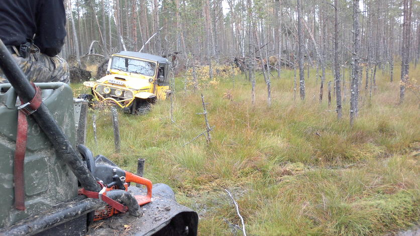 Laitetaas jotain matkastooria ja kaikki yhteen putkeen. Keskiviikkona lähdettiin matkaan Jannen kanssa joskus klo 16 jälkeen. Ajeltiin Vaalimaalle rajahoviin jossa treffattiin Joppa ja Offroadjouni. Muut olivat menneet yli jo aikaisemmin. Sitten alkoikin tulla kiire kun peloteltiin että virvokkeita ei saa paikallisista kaupoista virallisesti enään klo 22 jälkeen. Ei edes mietoja. No melkein kaikki ehti siiheksi rajasta yli paitsi Joppa jolla oli pientä paperisotaa viranomaisten kanssa. Viipurin veikoista viimeiset ostokset ja sitten suopuomille tankkaamaan. Puomilta lähdettiin kohtuu tarkkaan puolen yön jälkeen liikeelle kohti Metsäpirttiä. Jopalle maxilastaus suopuomilla kun tuntuu uudet sawit kantavan hyvin kuormaa. Pitkälle ei päästy kun wrangleri alkoi voblailemaan aika rajusti. Pysähdyttiin nesteelle täyttämään eturenkaat josko se hieman auttaisi. Yksi ongelman aiheuttaja tuntui olevan pyörän laakeri jossa oli jo klappia. Laitettiinkin Suomeen viestiä Kaken porukalle että yrittää etsiä laakerin kun olivat tulossa vasta torstai iltana.Pahalta näytti heti alkuunsa. Kuitenkin laakeri ei kuumentunut ja ilmeni että osa väljistä johtuu ilmeisesti kuluneista uniball nivelistä. Matka metsäpirttiin sujui rivakasti koska tiet olivat käsittämättömän hyvässä kunnossa melkein perille asti. Räkytäkyllä ajo Viipurin ohitiellä oli lähes hengenvaarallista kun jostain väljistä yms. ongelmista johtuen ohjaus tempoi laidasta laitaan. Varsinkin ohitustilanteissa ei meinannu kaistat riittää. Väihköstä myönsi että oikeen pelotti olla kyydissä. Takaiskarit oli myös ihan loppu ja metsäpirtistä ekaan leiriin ajettu kuoppa/nimismiehen kihara tie oli aika tuskaa takapään hakatessa kokoajan pohjaan. Metsäpirtin alapuolella olevaan leiriin saavuttiin joskus aamuyöstä kuvien aikaleimoista päätellen 3 ja 4 välillä. Joen ylitys jossa oli ollut kaunis jalan kuljettava silta oli muuttunut isoksi tukkirekalla ajettavaksi sillaksi. Onneksi sillä vesi oli niin korkealla että ylittäminen olisi ollut melko mahdotonta tai ainakin järjetöntä. Leirissä oli jo muu porukka mutta tulet oli olemattomat kun koittivat märkää puuta polttaa. Uglyllä oli sentään niin paljon intoa että kävi kelon hakemassa mutta sitä ennen sai palella. Tuntui että yö oli kylmin koko reissulla. ekan leirin tulilla Ilkka sahaa märkää pölliä lopulta saatiin makkaranpaisto nuotio aikaan Ugly ottaa rennosti Aamulla tehtiin ensimmäiset huollot kalustoon kun uglyHJ sai norran solmuun öisellä kelon haku reissulla. Jari viilaili sahoja kuntoon muunmuassa rälläköimällä purupiikkejä parempaan kuosiin. Täällä oli menossa melkoiset puutalkoot ja isoa kalustoa valui lumisuon suuntaan. Toisissa autoissa apukuskien viihtyvyys oli optimoitu. Läppärillä oli näytössä kamera josta näki kulkusuuntaan kun ei tuolta muuten näe ulos mitään. Matka muutaman kilometrin päähän lumisuolle alkoi läpi tukkiautojen tekemien mutarännien. Pian alkoi näyttämään melko pahalta sillä puuta ei oltu korjattu rajakankaalta ollenkaan. Varsinaista tietä pitkin ei päästy vaan kaatuneiden puiden kiertelyksi meni. Löydettiin ja sahattiin reitti jollain tavalla auki lumisuon laidalle. Välillä kierreltiin suon kautta kun puuta oli vaan ihan liikaa yhdessä nipussa. Ruokatauko pidettiin tutussa paikassa jossa muutamana vuonna oltiin leirissä Ladoga Trophyä katsomassa. Vettäkin alkoi sopivasti sataa Ihmismerkki Masa ja Janne Ilkalle selvitettiin reittiä sillä aikaa kun Jeeperi kiristeli sektorivartta joka oli ottanut kipeää puun runkojen ylityksissä. Tauon jälkeen hämärän alkaessa jatkettiin muutama sata metriä matkaa kohti ensimmäistä lumisuon varsinaista avosuota kohti. Ekoissä ränneissäkin oli jo melkoista vinssailua meille suora akselisille ja pikkurenkaisille. Muutama auto kävi avosuolla mutta Jari kävi tutkimassa jatkoa ja siellä oli edessä puuta nurin vaikka miten paljon. Pienen pähkäilyn jälkeen päätettiin vetää letka ympäri ja suunnatakohti uusia reittejä. Paluu reitti vastakarvaan olikin melkoisen haastava kun oli vielä pimeää. Volvon ohjausvarsia napsui poikki pari kappaletta ainakin kekkulilta. Ilkka oli Uazilla ongelmissa kun virrat alkoivat loppua akun ollessa oikarissa ja laturi zipissä. Sitten uazista rivahti vielä takaperä tai jotain vastaavaa ja loppumatkan se tuli liinan perässä leiriin. Paluu matka oli sen verran rankka että ihan vaurioitta ei uazikaan selvinnyt. ...mutta ei huolen häivää sillä nyt sai kuskitkin kytkeä henkilökohtaisen nelivedon leirinuotiolla käyttöön. Aamulla Heinolan pojista ei ollut enään jäljellä kun takalaita ja myöhemmin matkan varrelta talteen kerätyt makuupussi ja leiriytymistarvikkeet. Päättivät kääntää nokan kohti suomea kun uazissa ei ollut enään vetoja kuin yhdessä etypyörässä. Erikoinen päätös kun kuulemma näihin saa helposti varaosia joka kylästä. Aamupalaksi sektorivartta Taivutus normaali asentoon. Masapoika korjaa kekkulan volvon vetotankoja pari kappaletta. Joppa korjaa masapojan norran sillä aikaa Sitten vaan takasin sinne mistä oltiin jo tultukkin. Kuvassa ennen niin kaunis silta nyky kunnossan. Puuhapete rakkori teloilla Ei auttanut kun ajella tankille lempaalaan kun emme saaneet tankattua ekana yönä kun ajoimme pitkän siirtymän metsäpirttiin. Ensi reissuille kaikille mukaan tarpeeks kanistereita (ainakin 2 x 20l) ettei tarvitse välitankkauksia niin paljoa. Jopan autoon on tarttunut lepakkomies lempaalan huoltsikalla. Huoltoasemalla tehtiin urakalla jarruremppaa. Kekkulilta yritettiin tulpata wilwoodin satulaa ja itse tulppasin kuskinpuolen takajarrun pois käytöstä kun patrolin satula oli taas sylkenyt palat pihalle ja männän ulos. Huoltiskalta päätettiin jatkaa matkaa rasnoin kautta kohti miikkulaisia pitkin laatokan rantaa. Matkalla oli huimat kaasuputkitalkoot menossa. Voin vaan kuvitella millaisella orjilla tämäkin kilometr