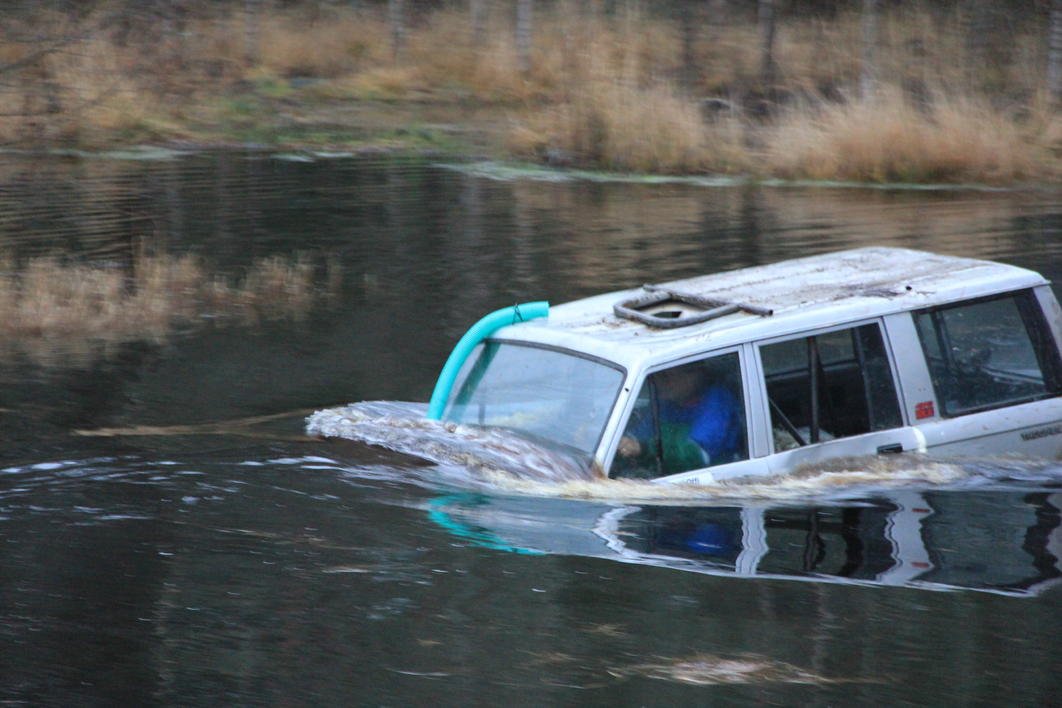 Kesällä kun valitettiin että saaristo oli vähän vaativa rakennetuillekin autoille, niin Esa sitten päätti todistaa, että snorkkelilla varustetulla vakio troopperillakin voidaan käydä siellä keskellä. Vesi oli sen verran viileää, ettei hän sinne nautiskelemaan kuitenkaan jäännyt;)