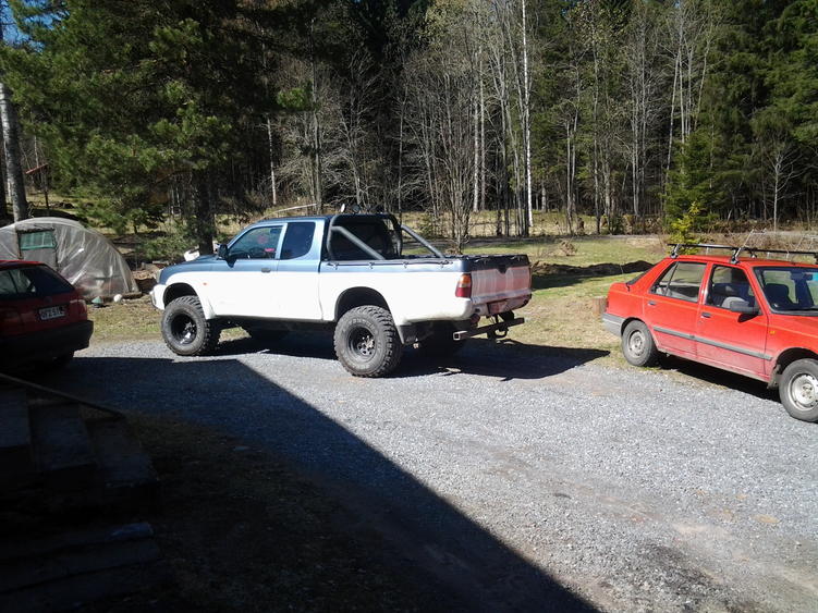 Pari kuvaa uusilla renkailla, vähän kattelin myös jousituksen liikevaroja. Huonot on. On tuo etupää vaan niin jäykkä kun on joutunut vielä vähän kirimään vääntösauvoja. Pitäis varmaan jotain kierrejousi viritystä kanssa värkätä avuksi tuonne.