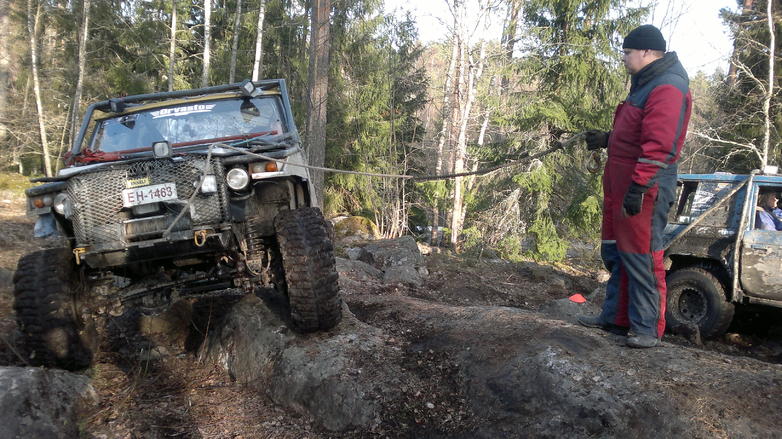 tuolla uudella puolella tuli pienet vinssaus harjoitukset kun maastobussi hiukan takertui polkuun ![]() ja pätkä mitsusta pomppas kardaani pois laatikon booreilta ja sitä sitten tutkittiin oikein porukalla, mutta linkkuveitsellä ja tunkilla ei saatu vikaa korjattua ![]() pete hälytettiin tuomaan oikein työkaluja että saatiin kardaani irti
