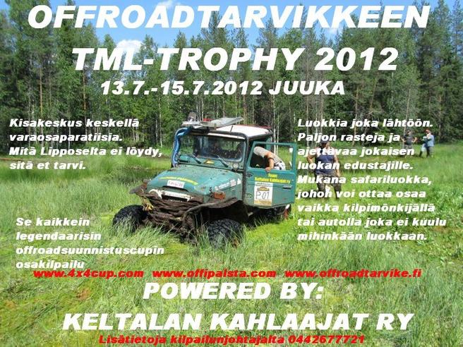 OFFROADTARVIKKEEN TML-TROPHY 13.-15.7.12 "KISAKESKUKSESSA SAUNA JA BUFFET"Paratiisi Offi on ohi ja TML lähestyy. Keltalan Kahlaajat lähtevät järjestmään Offroadtarvikkeen TML-Trophyn Juukaan. Lukekaa kilpailukutsu huolella, koska nyt on mahdollisuus päästä osallistumaan edullisemmalla hinnalla. Tämä siitä syystä, ett järjestäjillä on tänä vuonna aika pitkä matka Juukaan kisaa järjestelemään, joten jos osallistujia ei ole tarpeeksi 15.6. mennessä voi olla ettei kisaa järjestetä. Osallistujamäärän kasvattamiseksi, olemme lisänneet kilpailuun mukaan myös ns. safariluokan, johon voi ottaa osaa mys autolla, joka ei sovi muihin luokkiin esim. orbitrol-ohjauksella varustetut autot. Mukaan ei kuitenkaan huolita mitään romuja ja punakilvet ja vakuutus vaaditaan. Safariluokan ilmoittautumiset kilpailunjohtajalle. Mahdollisuus on myös osallistua mönkijöillä pareittain (osallistumismaksu 100/pari), mönkijöissä tulee olla sammutin, ensiapulaukku, puunsuojaliina ja mönkijän tulee olla tieliikennevakuutettu (punakilpi tai traktori ym.). Safariluokassa ajavat eivät saa auttaa cupluokissa ajavia kilpailijoita. Cupluokissa ajavat ovat etuajo-oikeutettuja rasteille mentäessä. Safariluokan kilpailijat antavat tarvittaessa tietä. Kilpailukeskus sijaitsee tuttuun tapaan Offroadtarvikkeen pihalla ja sen palvelut ovat käytettävissä entiseen tapaan. Tervetuloa sankoin joukoin Juukan mahtaviin maastoihin möyrimään. Keväisin terveisin kilpailunjohtaja Pekka Alatalo 0442677721 keltalankahlaajat@gmail.com Kilpailukutsu http://4x4cup.com/tiedostot/tml2012/...pailukutsu.pdf Ilmoittautuneet http://www.4x4cup.com/index.php?sivu...utuneet&kid=22 Ilmoittautuminen http://ilmoittautuminen.4x4cup.com/