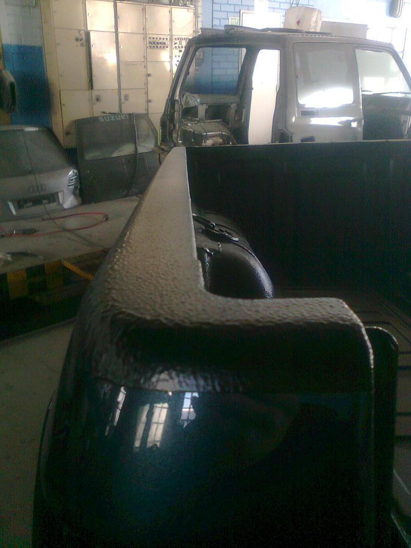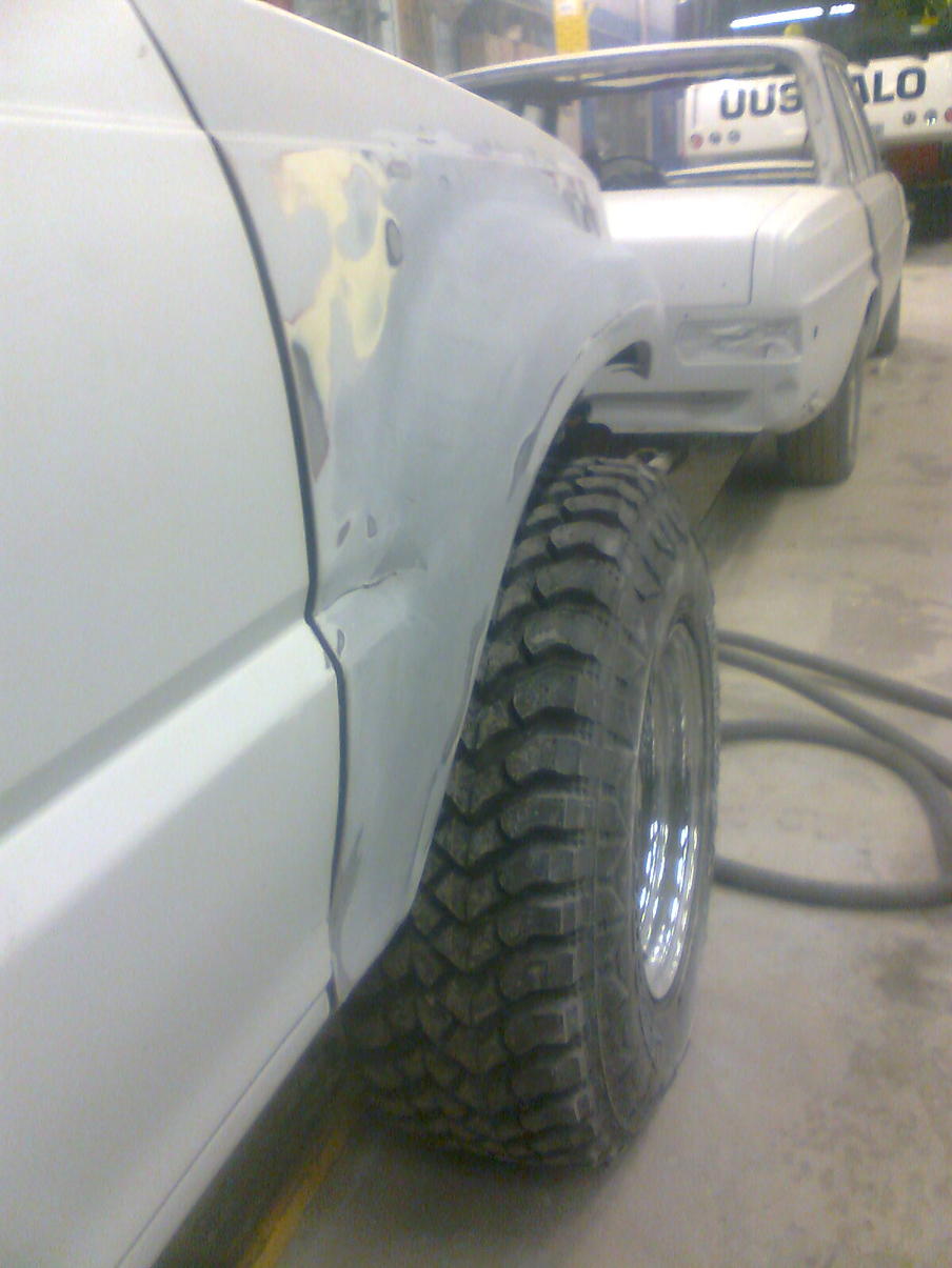 Elikkä tollanen Mazda B2500 Vm -97 2.5d aj.263tkm. Auto oli valmiiksi purettu entisen omistajan toimesta jolla oli porjekti jäänyt seisomaan pariksi vuodeksi. Autosta otettiin ruosteet pois ja pinnat oikaistiin. Lava ja suojat olivat huonossa hapessa joten hommasin uudet etusuojat ja 2600 mallin lavan. Renkaiksi tuli 10" leveät vanteet 31 kumeilla et 0. Renkaita sovittaessa huomattiin että kaaria joutuu lievästi levittämään. Monet muoviset ja lasikuituset kaaret kokeiltiin mutta tultiin siihen tulokseen että laitetaan 5cm laput väliin. Korin valmistuttua auton kori irroitettiin ja runko käytettiin hiekkapuhalluksessa, epoksoimassa ja massaamassa. Rungon takaisin saatua laitettiin korin ja rungon väliin 6cm koropalat, jotka kaveri sorvasi töissä. Auto hiottiin sisältä ja päältä. Auto maalattiin (maseratin) värillä. Samalla värillä maalattiin sisälle kaiutin korokkeet, puskurit ja peilit. Peileihin tehtiin sivu vilkuille paikat koska suojaan ei voinut enää vilkkuja asentaa. Autoon asennetiin kaikki uudet valot ja johtosarjat. Ennen lavan asentamista lavan sisä osaan ruiskutetiin U-polin lavapinnoite. pinnoitteen kuivuttua lava paikoilleen. ennen sisustan kasaamista koko hytti vuorattiin äänieristeellä jotta saataisiin hytistä hiljaisempi. eristeiden asennettua sisustaa kasaaman ja musavehkeitä asentamaan joina toimii alpine soitin 2X 8" groundin subia, groundin vahvari ja 3 tie kaiuttimet. penkeiksi valittiin -91 supran sähköjakkarat. Auto 4-pyörä suuntaukseen ja katsastukseen. Leimalle muutoskatsastetiin renkaat, levitys ja korotus. Leima tuli ongelmitta ja nyt ajellaan hyvillä mielin....
