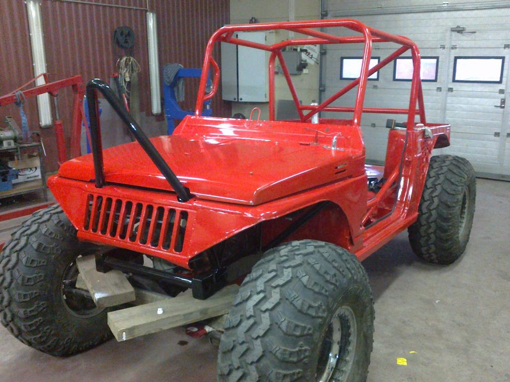 Tuossa kuvaa sivulta päin Nyt alkaa kuvat olla nykypäivän tasalla. Hommia olisi vielä kuitenkin tekemättä: Tehostimen pumppu pitäisi asemoida moottorin kylkeen. Latauksessa on jotain häikkää, mutta se selvisikin jo. Laturi kuulemma lataa melkoisesti virtaa jollei siinä ole laturin valoa Takakardaani pitäisi tehdä. Varmaan pitäisi liukua jotenkin jatkaa tms... Panhardi tarttis tehdä etuakselille. Hydrauliikkasylinterin kiinnitys etuakseliin ja ackermanin kulman haku. Hydrauliikkaletkujen veto ja säiliön kiinnitys. Etuakselin maalaus. Pohjapanssari. Jarrut. Sitten myöhemmin kisoja varten pitäisi vetää käsijarru taka-akselille.Ei loppujen lopuksi mitään älyttömän paljon hommia, mutta kuitenkin...