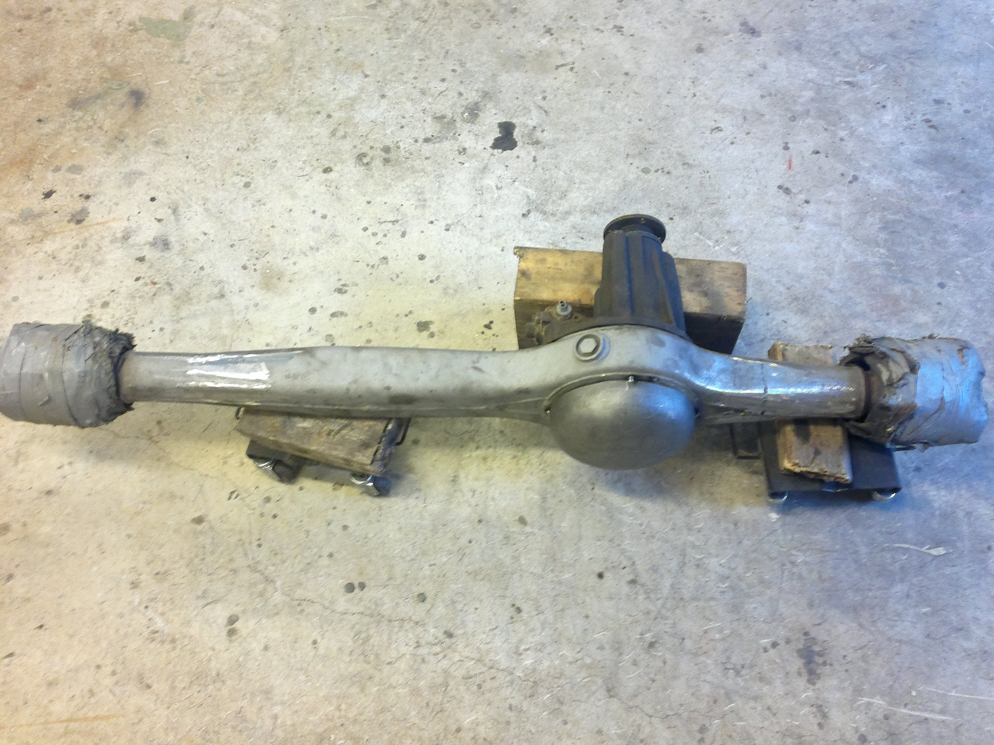 Ensin lamellilla kaikki vanhojen korvakkojen jne. jämät pois akseliputkesta: Sitten vanhojen lautaspyörän ja lukon kolojen täyttö + väärissä kohdissa olevien pinnapulttien hävitys: Hiluksin murikkaa apuna käyttäen kolmen pinnapultin siirto toisen kätiseksi: Lisää rautaa lukon uudelle paikalle, sitten uuden kätiset lautaspyörän ja lukon kolot kehään + etuperän etukoppa irti: Tämän jälkeen murikka jo istuukin paikoilleen 180 astetta käännettynä :Etupuolelta kurkkii vielä murikka tässä vaiheessa: Etupuolelta kaikki vanhan patin jämät pois ja tilalle putkipääty heftiin: Jotenkin härskin ison näkönen tu putkipääty paikoillaan... Lautaspyörällä on nyt enemmän tilaa kuin aiemmin ja varsinaista panssaria ei enää tarvi koska putkipääty yli 6mm terästä. Enää pitäs hitsata tuo putkipääty ympäri asti kiinni, muutaman pinnapultti puuttuu murikan kiinnityksestä, tyhjennysproppu banjon alapintaan, öljyntason tarkistusproppu keskelle perää ja lisää rautaa perän alapintaan että kestää hieroa. Siinäpä se murikan pyöräytys taitais sitten jo ollakkin... ja toivotaan että vetarit menee vielä paikoilleen eikä murikka kovin vinossa