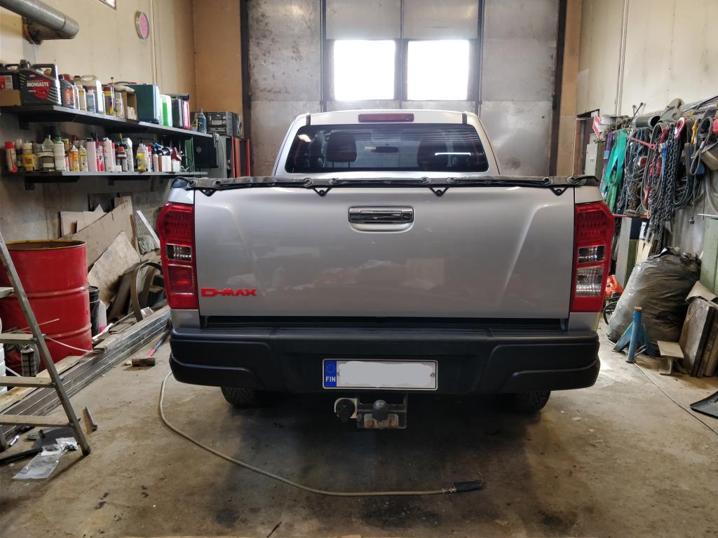 Auto palasi viikkositten maalarilta jossa tehtiin uudelleen autokauppiaan fiksarin tekemät kivenisku ruoste korjaukset eli maalattiin helmat ja lava luukun kera uudelleen. Samalla kun taka luukun kaikki merkit poistuivat niin tilalle tuli pelkkä d-max merkki ja sekin punaisena kuten keulan isuzu teksti. Lava muovin reunojen alle laitoin kiveniskuteipit ja kuraläpistä tein REILUSTI isommat "kuraläppä" kumista. Kuraläpät vaihtuu viellä johonkin kuorma-auton ei kumisiin läppiin koska tuo kumi tuntuu käpristyvän ihan mahdottomiin muotoihin rullaussuunnan mukaisesti vaikka niitä rullattiin jo pari viikkoa vasta suuntaankin lämmön kera. Takapuskurin kromitkin sai mattamustan autoteipin niskaansa samalla kun puskin oli pois ja purettuna. "Kesä" renkaat laitoin alle eli nuo aiemmin mainitut 265/70R17 oolterrainit VANNETUKUN PASKA peltivanteilla joissa on kahdessa aivan järkyttävästi heittoa mutta juuri tuon paska firman rajojen alle. Vanteet vaihtuu heti alumiinisiin kun vaan jauhemaalarilta kotiutuvat. Nykysillä vanteilla joissa ET20 ja leveyttä 8" rengas tulee takana juuri kaarelle mutta tulevat vanteet joissa ET15 ja leveyttä 8,5" niin sit tuleekin jon reilu 10mm kaaren ylitte.