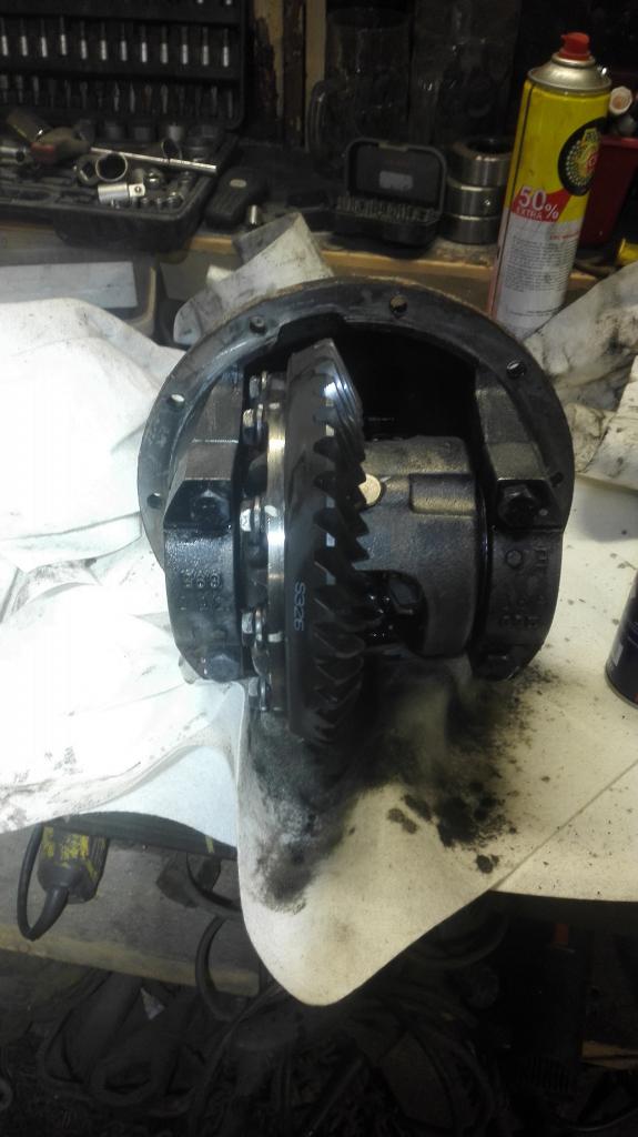 Jarrurummut irti, abs tunnistimet irti, jarrukengät pois, jarruletku pihdeillä tukkoon ja jarruletku irti. Nyt akselin päästä neljä pulttia irti ja vetoakseli vaan vedetään pois. Nyt alkaa se hauskuus eli akselissa on abs kehä joka pitäis saada pois. Annettiin vähän lämpöä kehään ja sen alla olevalla mutterilla työnnettiin kehä irti. Kehää ei kannata järjettömästi hehkuttaa ettei hampaat vaurioidu. Itse laakeri lähti vähän raudalla vääntämällä koko pakettina. (vasemmalla puolen laakerin mutteri on sitten ilmeisesti ryssänkierteellä) Sitä ei tarvinnut vaihtaa vaan akselin päässä (missä ne 4pulttia) 4kpl sinnilevyjä 3kpl 1mm ja 1kpl 0.5mm. Otin vaan 0,5mm levyn välistä ja näin laakeri kiristyi ja välys lähti. Uudet laakerit vaan akseliin ja tiivisteet. mitään prässiä ei ollu käytettävissä joten rikottiin vanha laakeri ja siitä saatiin holkki jota takomalla painettiin uusi laakkeri paikoilleen ja akselimutterilla kireelle. Laitettiin abs kehä noin 20cm pitkään ja halkaisijaltaa noin 15cm rautaputkeen ja pillillä lämmittettiin kehä tasaisen kuumaksi (ei suoralla liekillä) kauttaaltaan niin ei tarvinut kuin pudottaa akselia pitkin takaisin paikoilleen. Kannattaa tosiaan vaihtaa myös ne tiivisteet perästä abs anturin jälkeen. ei mee vaseliinit ja hyboidi sekasin. Nyt voisin jälleen esittää muutamia kysymyksiä tietäjille, kun samalla nyt kun oli akselit jo irti niin käytettiin myös perämurikka auki, että näkee myös sisempien laakereiden, hammastuksen yms kunnon ja täydellinen puhdistus samalla. Eli rangerissahan on ilmeisesti Danan perä? Mutta mikä on se tarkempi malli? En netistä löytänyt samanlaista eli edestä aukeavaa. Kun paketti on kasassa ja perään tulisi laittaa uudet öljyt niin tilavuudeksi ilmoitetaan 1,9 litraa joka on liian vähän. Öljyksi meni suosituksen mukaan castrolin 75w-140 limited slip ja sitä meni noin 2,5 litraa. Tässä oli koko operaatio epäselvästi selitettynä