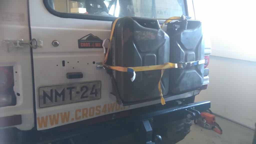 Lauantaina kävin motonetin kautta ja otin kaikkea kuluvaa kampetta varalle,suodattimia, hihnat yms. Peräluukkuun tein roskaraudan pätkistä kahdelle jerrylle telineen, kolmas pitää laittaa johonki.. Katolle eteenpäin valaisemaan lediä lisää. Renkaan täyttö on pitkäveteistä hommaa ollu, niin laitoin toisen kompura rinnalle. Raadionkin kytkin ja oviin laitoin uudet halvimmat kajarit mitä biltema myy. Sit taakse tulollaan jonkun sortin vaneri ylä hylly, johon upotin jotkut vanhat mutta ehkä toimivat 6x9 kaijuttimet. Muuten pitäs olla auto aika ok kunnossa. Jotain varaosia pitää vielä tehdä, kuten vara taka-kardaani ja 25spline etu vetarit kasata valmiiksi. varaosia otankin reilusti kun niitä kerran on. Mm. Etuvetarit, avoin etuperä, etu ja taka kardaanit, startti,tehostajan pumppu ja letkut, lisä laturin vara laturi, kaikki ohjaus varret purettuna, apusimpukka, yks etupyörän napa. Tietysti perus ala ja ylä-pallo nivelet, etu ja taka pyörän laakerit, kaikki öljyt ja suodattimet, jarru putki kieppi jne. Taka-akselin vetareita ei ole, mutta niitä ei kuulemma saa poikki??!!Tuleehan tuosta vähän painoa, mutta parempi osat mukana kun kotona