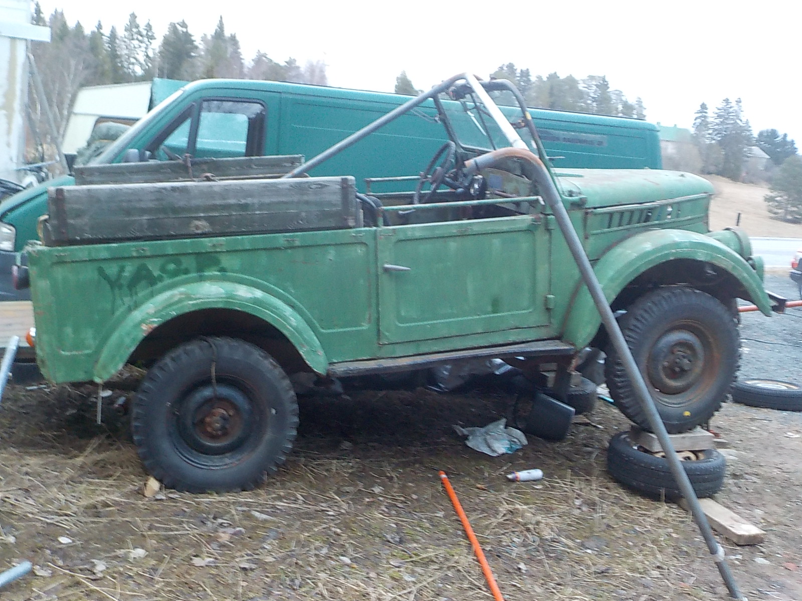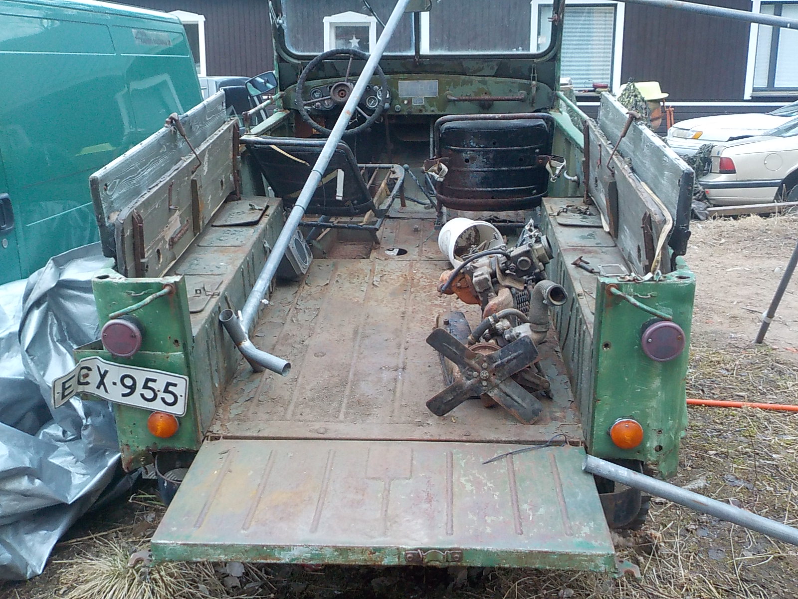 hommattu tuon uudemman koneen tilalle, volvo B20+vaihteisto ja pätkä kardaania. alettu vaihtaan. helppo homma koska jakolaatikko kardaanin päässä, auto pinta ruosteessa, vahvaa peltiä, ei tarvi hitsailla, pohjaan massa/öljykäsittely ja sisäpuolelle? mitä haluaa.avoauto/ hekilöauto 8- hengelle. vinssi auton alla, voi vedellä joka suuntaan,ex- omistaja vaihtanut uudet jarrut+ paljon muuta, oli sf- armeijan töissä. auto siviili kilvissä, ja tähän saa mustat kilvet, oginaali nokkapala ja pelti sekä kupari syyläri löytyy. ja saa laittaa 235/85 renkaat, pirkanmaa 0400-45084nolla. jottai 1600-2000e vaihto erikseen, tarjoile tuotteitasi.