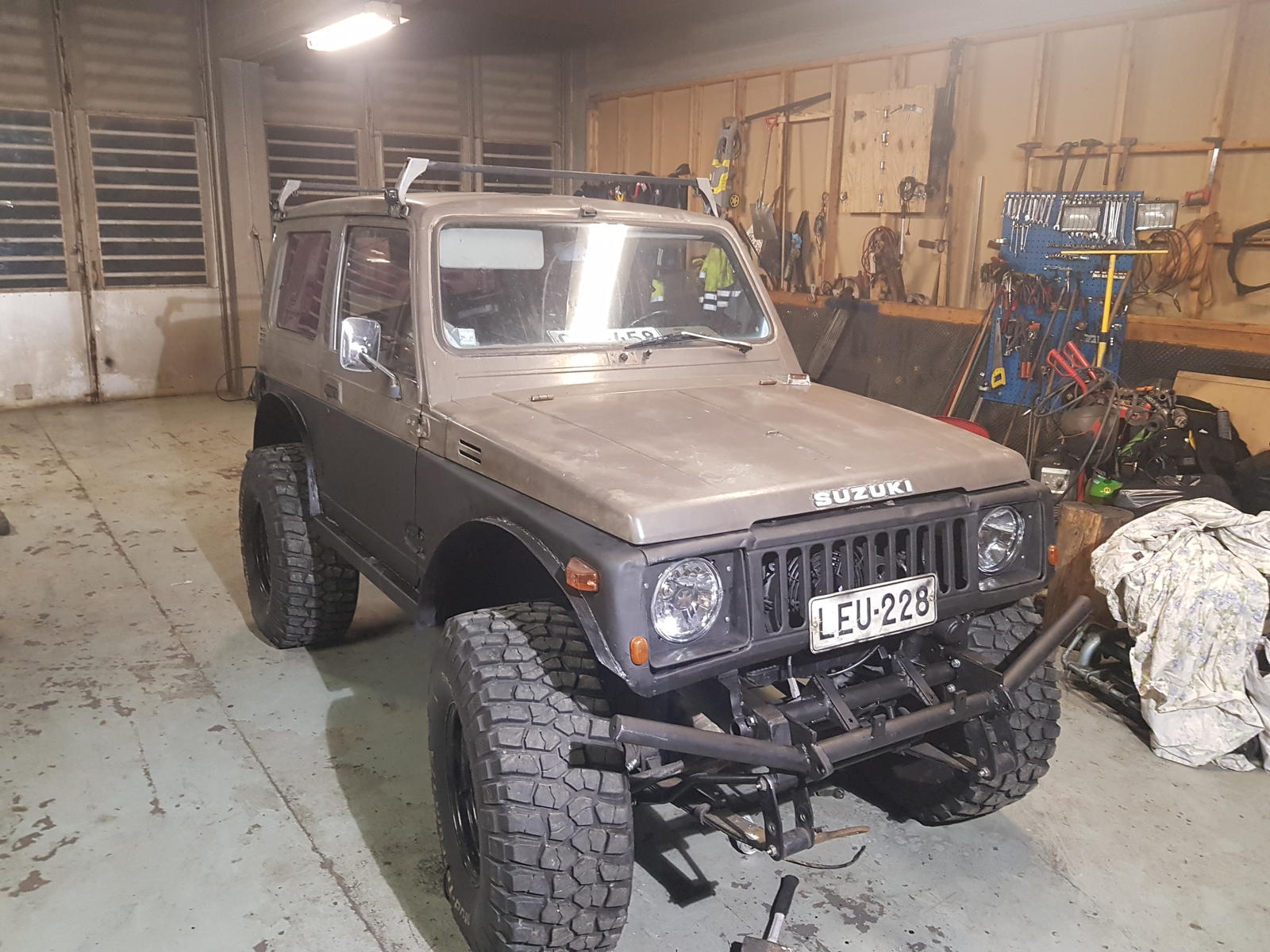 Sj410 1.6 16v automaatti toyotan akseleillaHei. Tässä on tullu harrastettua tuota suzukia jo jonkin aikaa ja ajattelin pikkusen kirjotella. Lähtökohtana oli tuollainen halvin mahdollinen Sj410. Aluksi ostin siihen 31x10.5x15 rattaat, ja eihän ne tietenkään mahtunu pyöriin. Joten rälläkkä käyntiin ja kaaret uusiksi, samalla vaihtui alusta. Sitten keksin että 10x15 et-44 vanteelle ei 10.5 leveä rengas ole sopiva, joten renkaat vaihtui 33x12.5x15 mutikoihin. Kun kaaria tuli vähän avarrettua niin piti se koko koppaki hitsailla asiallisempaan kuntoon, ja samalla tuli palkkihelmat. Alusta asti tekniikka oli tarkoitus vaihtaa, ja tekniikaksi valikoitui 1.3 16v 2001 balenon tupla kateilla varustettu G13BB. Tässä siis paikallaan sj413sen öljypohja ja moottorikorvalliset. Ja perässä Sj413sen laatikko. Balenon vakio pakosarja modattiin ja imusarjaksi vaihdettiin Jimnyn sarja jotta homma olisi vesiletkujen ja pakoputken osalta bolt-on tyyppisempää. Myös puskurit tuli samalla tehtyä semmoset että vinssinkin saa paikalleen. Ja viimein koitti hetki että auto oli leimaa vaille "valmis" Ja leima tuli laakista. Ensimmäisellä safarilla sitten koeponnistettiin autoa. Hyvin muuten pelasi, mutta syyläri osottautui pieneksi, oli vanha sj410 mallinen bilteman 10" puhaltavaksi laitetulla flektillä. Safarivarusteita lisätty sitä mukaa ku on ollu tarvetta. Elkkä 2" jenkkimallin vetokoukku ja safariteline tuli laiteltua ja samalla garminin GPS. Sitten tuli snorkkelia ja myös syyläri vaihtui honda civicin alujäähyyn ja flekti edelleen puhaltava mutta spallin noin 1000 kuutiota pukkaava malli. Sitten oltiinkin valmiita Raajärvelle ja Lapland Trophyyn. LT:stä jäi käteen hyvä reissu, mutta autosta löytyi myös huonosti toimiva vinssi. Vinssille tehtiin täysremontti, jossa meni vaihtoon kaikki johdot ja rele, tämän jälkeen alkoi olemaan melkoisesti vinssissä tehoja. LT:n jälkeen alkoi pikkusen enemmän polttelemaan sitten lukolliset akselit. Ja muutenkin pieniä jatkojalostamisen tarpeita löytyi. Purkasin yhtenä viikonloppuna kaksi autoa: LN65 hilux josta akselit ja sitten toinen baleno josta moottori. Tässä vaiheessa oli jo hankittuna automaattilaatikkokin peräisin vitarasta. Näistä ensimmäisenä työnalle meni laatikko ja moottori setupin vaihtaminen. Laatikoksi tuli 03-72LE eli vitaran 4 vaihteinen sähköohjattu malli. Moottorin ja vaihteiston vaihtoon liittyi sitten kummankin johtosarjan sovittaminen, kepin modaus, tunnelin modaus ja välikardaanin rakenteleminen. Jotta homma ei olisi ollut kovin pitkä operaatio, niin päätettiin tehdä homma yhdessä viikonlopussa. Savotta aloitettiin perjantaina aamulla 08.00 ja ajelin sitten töihin maanantai aamuna uudella tekniikalla. Tekniikan vaihdon jälkeen sattui löytymään 2000luvun alun 911 porschen penkit edullisesti, ja vanhat penkit oli jostain 600tkm ajetusta L200sesta mitsusta. Joten eivät olleet enää kovin ryhdissään. Muutos ajomukavuudesssa tuntui häntäluussakin pikkuisen hellittäneenä pakotuksen tunteena 200km siirtymillä. Sitten tällä setupilla käytiin Psoryn kuurankierto kahlaamassa lainarenkailla. Ja täytyy sanoa että 31x10.5x15 special trackit oli aika positiivinen yllätys lumessa, varsinkin kun vertaa 33x12.5x15siin yli kymmenen vuotta vanhoihin mutikoihin. Tältä raajärven matkalta jäi sitten kotiin tuomisiksi 5 kappaletta tulevia suzukin renkaita 6x6 volvosta. Kokona 35x16x15 beadlock vanteilla ja aika erikoisella et:llä ja jaolla. Näihin joutuu sitten keskiöt vaihtaan.