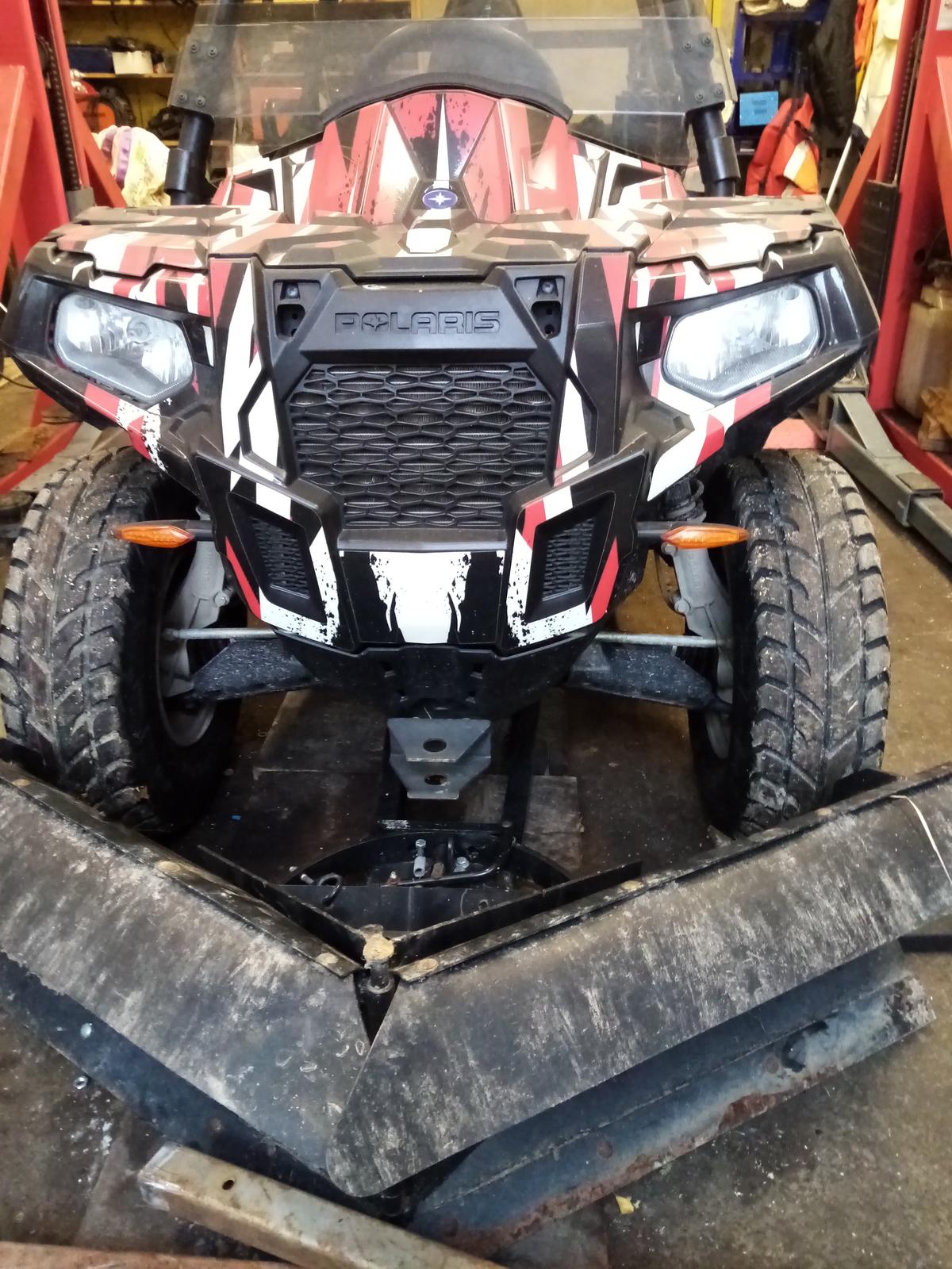 Polaris työlaitehydrauliikallaPolleen olisi tarkoitus laittaa puskulevy hydraulikäännöllä ja hydraulinostolla. Taakse kippi/nosturihyrauliikka.