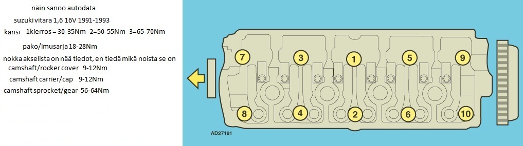 ![]() Vitara kansipulttien momentti? LöytyiKyseessä -92 1.6 16V 71kW kone Kannen pulttien kiristysmomentti hakusessa + järjestys Lisäksi nokka-akselin kiinnitysripojen momentit, nokka piti irrottaa Pakosarja/imusarja myös Suzuki-infosta sain ladattua manuaalin mutta se on 1999 mallin, liekö samat? Löytyisikö joltain ko. vuosimallin kattavaa manuaalia Edit: ja löytyikin jo, kiitos lähettäjälle