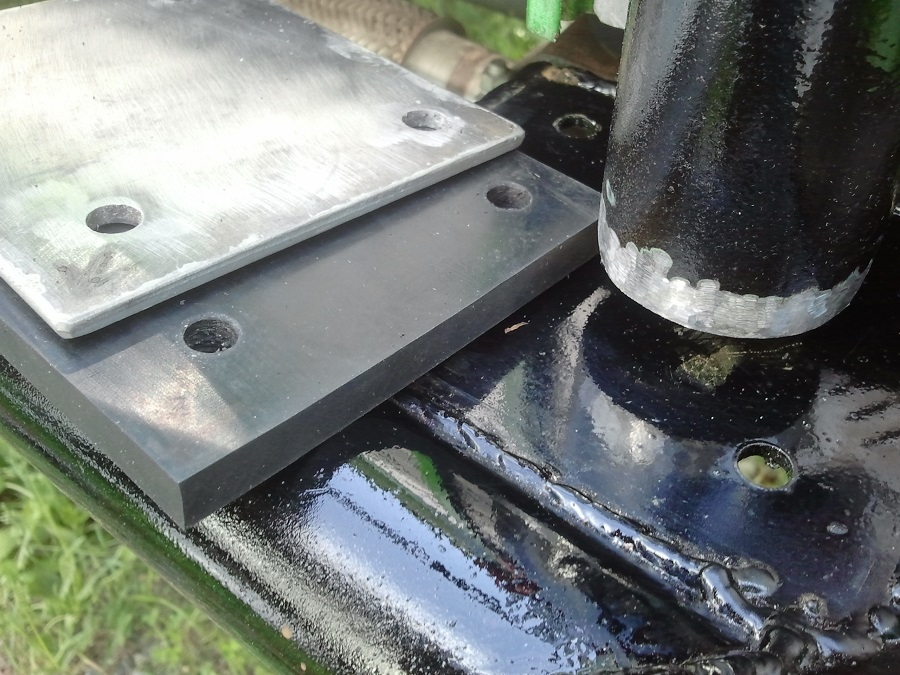 Elikkäs helmaputkien etuosaan tuli alusta turvakaarelle. Tämä kuva yläpuolelta Alapuolelta kuva Ja koska kaaret ovat kiinni sekä korissa, että rungossa, laitettiin kaaren kiinnityksen väliin n.1cm paksua kumia estämään mahdolliset tärinät. En tiedä olisko ollut tarpeellinen, mutta muutaman vuoden ajelujen perusteella toiminut ainakin hyvin. Kuminhan voi aina ottaa poiskin jos haluaa... Lappu hitsattuna kaareen |