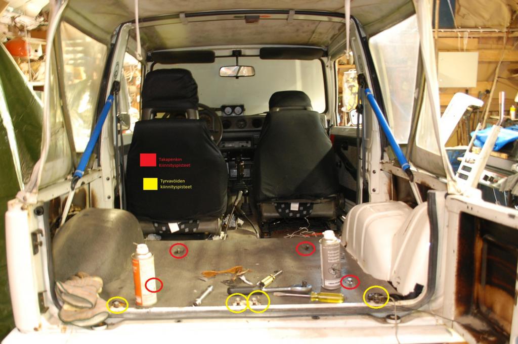 Jotkut rei'istä tais olla läpi asti, mutta esim nuo etummaiset penkin kiinnitykset menevät lattian alapuolella olevan poikittaisen vahvikekourun sisälle, joten niitä ei ainakaan pääse rukarilla tökkimään.