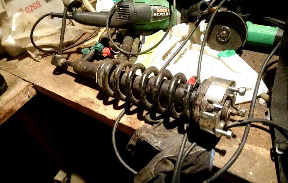 Tarkoittanee bumb stoppia joka estää renkaan pääsyn liian ylös. En ainakaan löytänyt muuta mahdollista jousen rikkojaa. Ja tosiaan jääkiekot ja asennusmassa on kuivumassa tähän tarkoitukseen. Aivan 35mm kiekkoa ei tuohon voi laittaa muuten häviää liikkumavara kokonaan ja autosta tulee suurinpiirtein jouseton. |