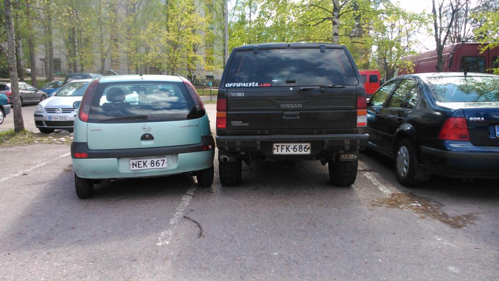 Naapuri oli taas pysäköinyt hienosti, kun tulin kotiin. Eikä ole ensimmäinen kerta. ![]() Joillekin se on näköjään niin hemmetin vaikeaa. Varsinkin mustille miehille. Toivottavasti ei ole aamulla kylki rutussa.