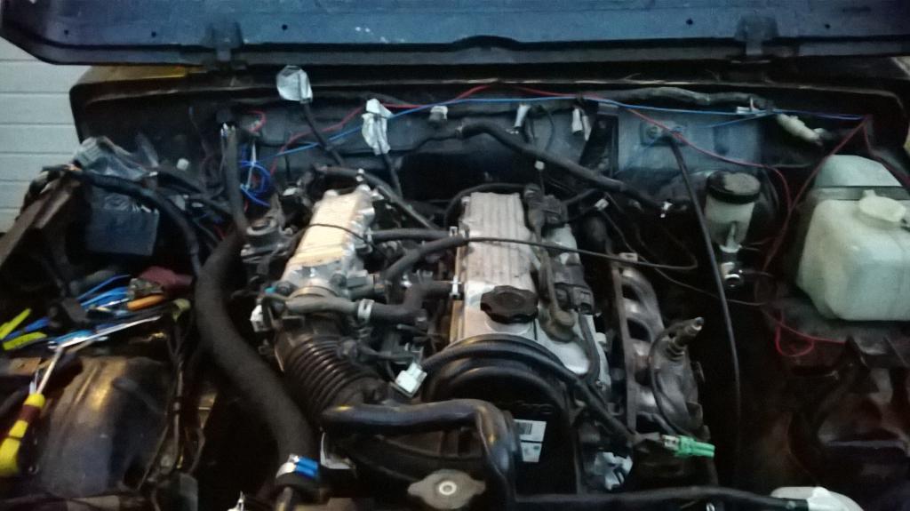 Ongelma on bensan syötössä. Vanhat pensan paluu/tulolinjat on käytössä ja autoon on kokeiltu kahta eri sähköistä pensapumppua. Ongelma saattaa piileä pensan paineessa. Onkoha paineensäädin koneessa kuinka ronkeli? Auto on saatu käymään todella vaivalloisesti. Kaikki sähköt pitäisi olla kunnossa. Luovuttaja auto on kolari auto (keulavaurio) ja siinä kone kävi OK, mutta moottorin vika valo paloi. Se saattoi johtua jäähtysneste vuodosta ja lambda johdon nirhaantumisesta? Vika voisi tietenkin piileä myös ECU:ssa, voikohan sitä jotenkin testata ilman että auto on käynnissä? Ehotuksia ongelmasta otetaan mielellään vastaan