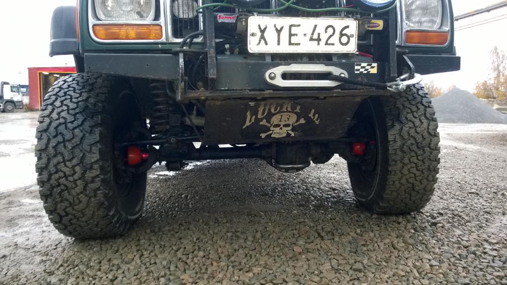 Jos nyt puhutaan siitä turhanpäiväisestä kumilerpakkeesta siellä konehuoneen alaosassa, sillä ei kyllä tee yhtään mitään. Jos ajaa syvemmässä mönjässä niin se ei suojaa mudalta tai vedeltä mitään, mutta tosiaan aiheuttaa sen poistumisessa ongelmia. En itse huomannut mitään eroa kummassakaan XJ:ssä laturin keston tai moniurahihnan hihnapyörien laakerointien kanssa oli sitä kumilerpaketta tai ei. Molemmilla tavoilla hajosi latureita, ja aivan yhtä helposti   minulla oli laturi sekä orkkispaikassa alhaalla, että ylösnostettuna kompuran tilalle. Mitä tulee taas tuollaiseen etupään viistoon teräslevystä tehtyyn "sukseen", niin siitä on hyötyä paljonkin, kuten tuossa ylempänä onkin jo todettu
