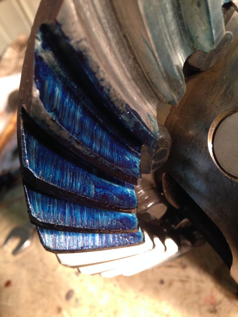 Rikkinäinen laakeri vaihdetaan. Mietin vaan tuota samaa, että mitä käytetään esikiristyksenä jos toinen on uusi ja toinen vanha laakeri. Jotain siitä väliltä siis. Edit: tarkennetaan vielä, että perään on entisen omistajan puolesta vaihdettu 4.11 välitys ja nyt lähdin tarkastamaan hammaskosketukset. Osien alkuperää en tiedä, mutta eiköhän ne ole käytettyjä. Veikkaan, että välitysten vaihdon yhteydessä hammaskosketukseen ei ole kiinnitetty paljoa vaivaa: Ensimmäisenä huomio kiinnittyi poskilaakereissa olevaan välykseen. Poskilaakerin shimmin ja laakeripukkiin väliin meni 0,5 mm rakotulkki kevyesti. Nuo väriainekuvat ovat lähtötilanteesta, jossa poskilaakerit on painettu toiseen laitaan. Kunhan saan jotain shimmilevyjä käsiin ja poskilaakereiden välykset pois, sekä hammasvälin kohdille, niin sitten näkee täytyykö pinjonia siirtää. Viimeksi muokannut raipe : 21.12.2014 20:07 |
