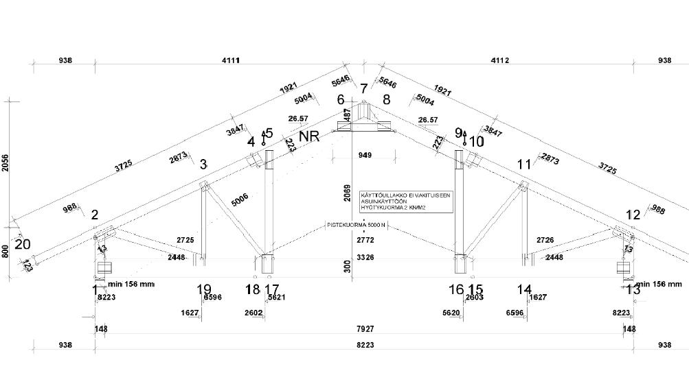 Kun suunnittelin tallia niin tarkoitus oli laittaa kattoon Koneen nostokisko profiilit. Eli molemmille sivuille pitkittäin profiilit ja niiden väliin poikittain profiili. Eli sellainen siltanosturi. Saa siirrellä tavaraa minne lystää. Tätä varten kattotuolit suunniteltiin siten että kukin kattotuoli kantaa noin 3m etäisyydeltä seinästä noin 500kg kuorman. Lisäksi kattotuolien on kannettava hyötykuormaa sen 2kN/m2, koska vintille tuli käyttöullakko romuja varten. Ohessa piirustus millaiset kattotuolit tuo vaatii. 300mm kertopuuta alapaarteet. Nosturi tosin lojuu vielä tallin lattialla kun projektit syö aikaa