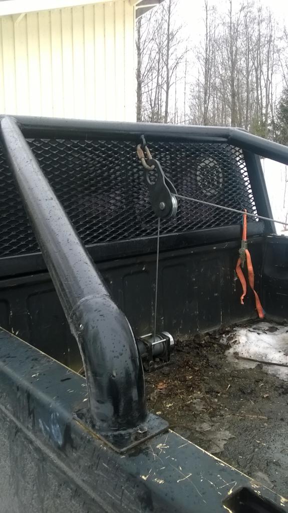 Vinssi vetää melko hyvin ja väkipyörän kautta kun vaijerin kiinnittää alalevyyn niin voima tuplaantuu. Vetopiste siirtyy samalla alemmas. Eihän tuossa ohjaustehostimessa paineita ole kuin 60 bar. Ja voihan piukan paikan tullen vinssiä ajaa nosturin hydrauliyksikön kautta(170 bar). Nosturin käännöstä tuli vähän hidas mutta ainakin jaksaa kääntää vaikka auto olisi kallellaan