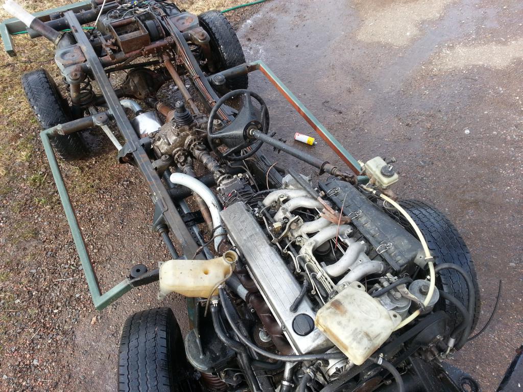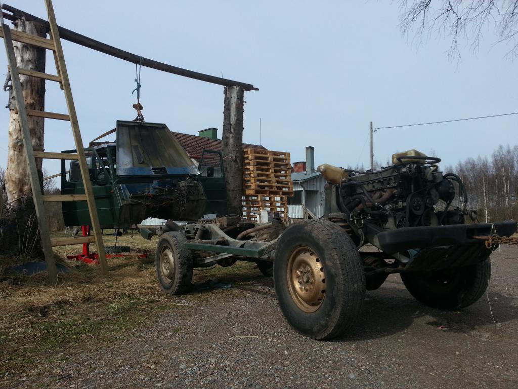 Moottori tuli vaihdettua jo aiemmin, olisi ollut kyllä nyt helpompi. Meinaa tulla parempi kuntoinen jakis tuon tilalle, pitää silloin vaihella kummit. Mistäköhän näihin kannattaa osia ostella, laakereita, puslia, jouset ym ? Täytyy vaihtaa samalla jarru- ja polttoainelinjat uusiin. Mekaaninen vinssihän siellä on..