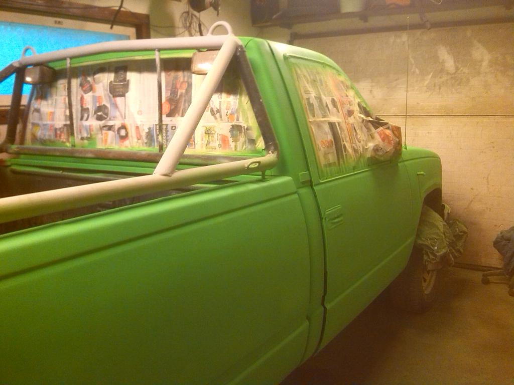 Maalia pintaan. Se on se hetki, kun saa jotain melkein valmiiksi. Ihan kohtalaisten mätätalkoitten jälkeen siitä tuli vihreä. Autohan on Chevrolet K1500 1992. Näyttelypintaa turha hakea tähän, kun on puhdas työkalu kyseessä.