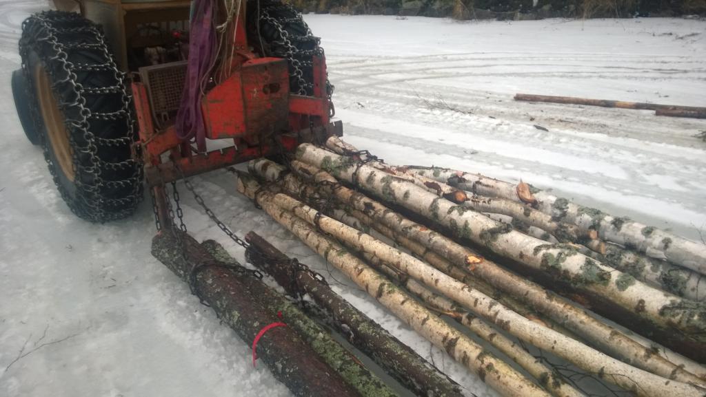 Riimun pätkä vain hirtetään puun ympäri, vinssin vaijerin päässä riimuun sopiva koukku. koukkuun voidaan kiinnittää useampia riimuja, ja jos vinssaus linjalle sattuu useampia runkoja, voidaan ne vinssata samalla vedolla uran varteen (mikäli vinssin puhti riittää). Kun runko/rungot on vinssattu vinssin juureen, irroitetaan riimu vaijerin koukusta ja siirretään juontopankkoon. Riimu mahdollisimman tiukalle, jotta ajossa vinssi ylhäällä pankkoon kiinnitetyt puun päät roikkuu ilmassa, eikä toppaile joka kiveen ja kantoon. Kun sopiva määrä perässä, niin siirto laanille. Varsinkin vanha takavetoinen etenee paremmin isolla kuin pienellä kuormalla. Painava kuorma tuo pitoa takarenkaille, etuset melkein ilmassa, jarruilla ohjaillen. Itse pyrin asemoimaan traktorin niin, että saan vinssattua mahdollisimman paljon runkoja samasta pisteestä. Suosin riimuja juuri siksi, että ne on helppo kiinnittää vinssauksen jälkeen suoraan vinssin juontopankkoon, laanille siirtoa varten. Jos vinssaisin pelkästään uran varteen, josta pois ajo tapahtuisi myöhemmin, olisi kolmikärki sakset varmasti paremmat. Tapoja on varmasti yhtä paljon kun tekijöitä. Ja jos pelkää katkeavan vaijerin sivallusta, tulee ehkä miettiä onko vaijeri liian ohut/heikko? n.20 vuotta vinssattu samalla vaijerilla puita ja koneita suosta, eikä kertaakaan ole vaijeri katkennut, ensimmäisenä luistaa vinssin kytkin tai sammuu kone. Hankala pukea ajatuksia sanoiksi, vieläpä niin että joku muukin ne ymmärtäis. Viimeksi muokannut Automa : 20.08.2015 15:58 |