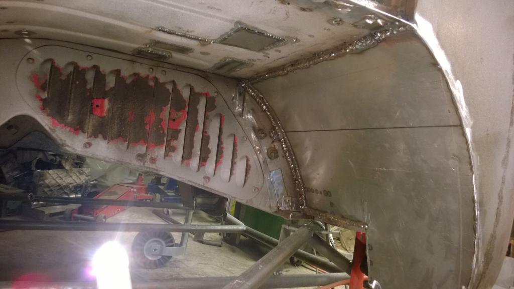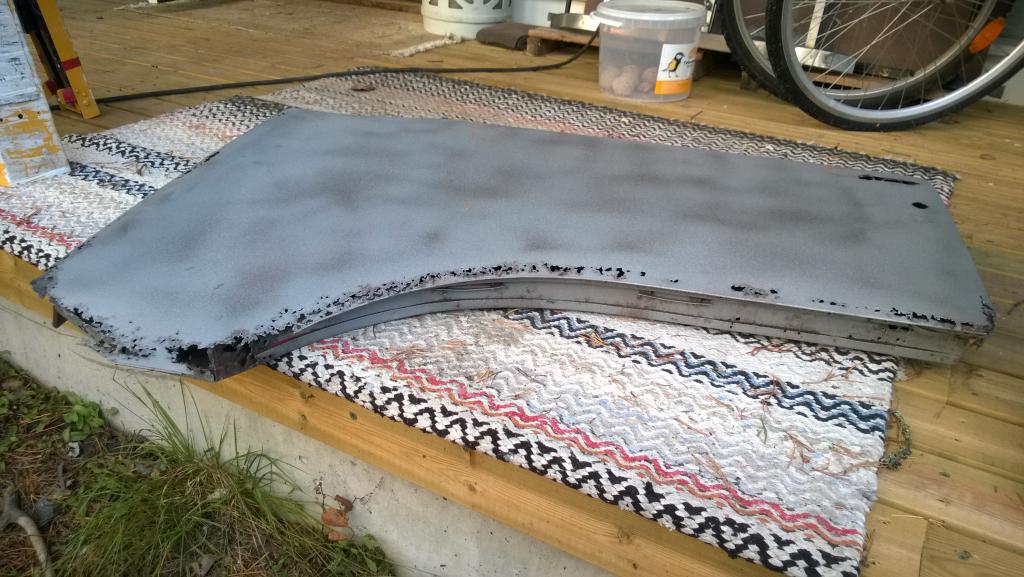 Alaosan reunuksen uusiminen tuli tehtyä kolmessa osassa, prosessi tuossa meni jotakuinkin niin että ensin leikkasin vanhan reunuksen pätkän pois, tekasin uuden vanhaa sapluunana käyttäen ja uus hefteillä tilalle. Sitten kun koko reunus oli vaihdettu uuteen hoitelin ruosteet pois. Nyt sekin odottelis enää yhtenäistä saumaa... Ens viikko menee aikalailla riekkojahtiin valmistautumisessa ja ite reissussa joten homma etenee taas reilun viikon päästä