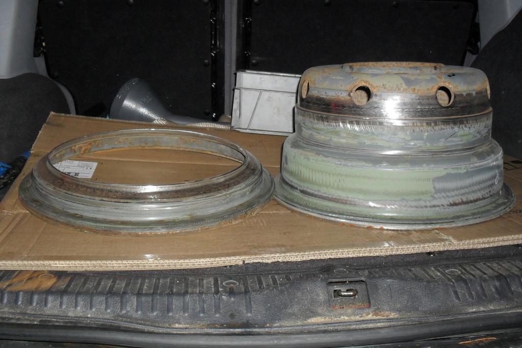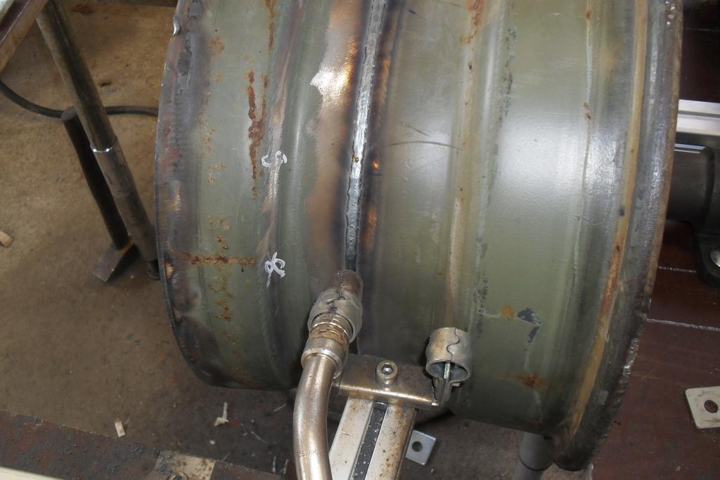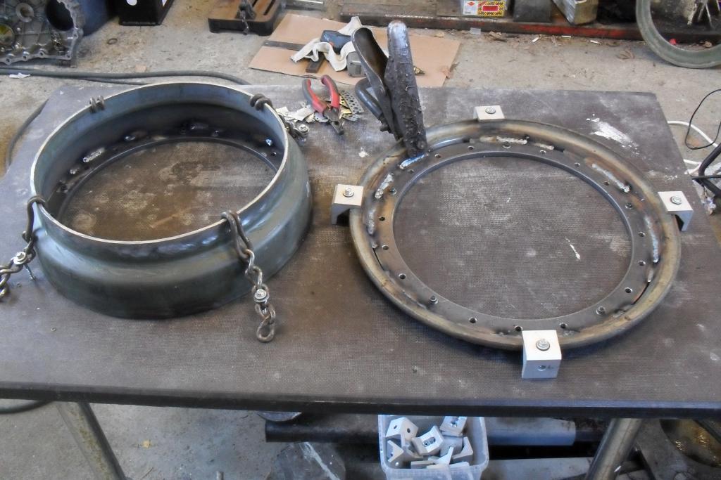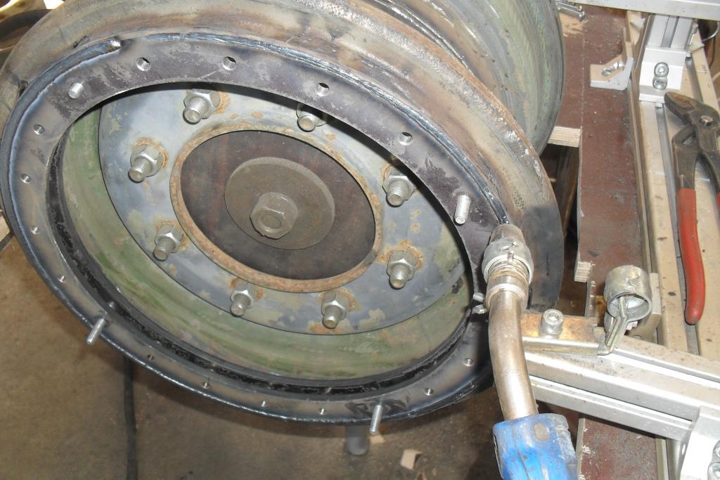 Se uloin osa on pultattu vanteeseen kiinni väärinpäin hitsausta varten.
