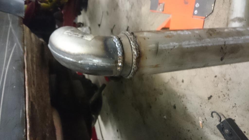 Ei miellyttänyt ensimmäinen versio putkesta niin, hain tänään oikeen kaupasta jousto pätkän ja hitsailin käyrät uuteen malliin. On ainakin vinssi kardaanille tilaa vaikka onki lähöstä saakka paksummalla putkella. Ylimääräisen jousto osan takia sai putken vietyä rungon ja korin välistä suojaisessa paikassa, niin tiukka väli että "jäykällä" putkella olisi resonoinut johonki. kolmen tuuman rosteri putkella menee taakse jonka päähän hitsattu 60mm laakerinkooli ja mutka. Just sopivasti vaimentaa 15mm kuristus putken päässä.