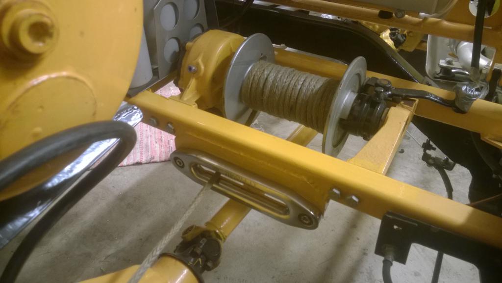 porasin 16mm pultille palkkiin reiän, mutterista sinkitys rälläkällä pois, hitsasin mutterin juurestaan ympäri asti palkkiin ja sitten M16:lla pultilla vielä palkin läpi naama irvessä kiinni. Katotaan kestääkö. Palkin nurkkiin liimasin samassa rytäkässä nuo pakolliset heijastimet. toivottavasti kelpaa konttorilla. Takavinssin kitojen telineet/kiinnitykset miggiliimasin paikoilleen, maalia päälle ja jonkin ajan kuluttua kidat paikoilleen. Pohjakierroksen ehdin jo naruakin keriä paikoilleen. Seuraavana listalla vois olla tuon vinssin ohjaus niin saa tuonkin kokonaan valmiiks. |
