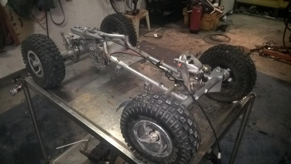 Rungon puoli alkaa hahmottua. Sähköpyörätuolin moottori haki paikkansa, joka tuli mönkijän mukana. Akkutelineelle paikka ja tilaa pitää jättää myös toiselle kun "moottorin" saa virittää tarvittaessa 24 volttiin. Oikean puoleista "poljinta" ohjataan kaukosäädöllä hajonneen sähkövinssin jäämistöllä, ettei nuori kuljettaja ole puistossa karkuteillä heti ekoilla ajokerroilla.