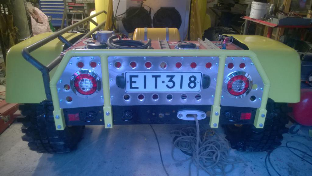 käyttö niin tänään otin ja tekasin rungon takaosan vastaavanlaiseksi niin näki että miten nuo materiaalit passaa toisiinsa... Samoten piti vaihtaa leimarenkaat alle että näkee vähän miten tuo lavan reunan korkeus passaa... Vähänhän tuo on turhan bling-bling meikäläiselle mutta ei se kauaa kiiltele kun ajeleen pääsee Nyt sitten pitää tekasta tuo kuskin laita loppuun ja kopioida sama vänkärin puolelle. Sitten vinssipuskurin kimppuun... |