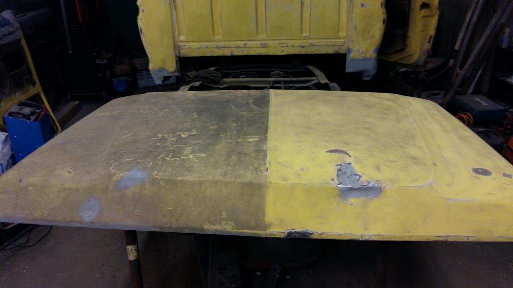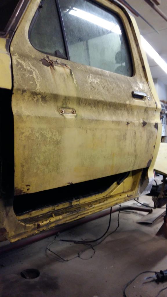 Ajankuluksi aloin parsimaan ovien pitsiksi muuttunutta peltiä hiukan kiinteämpään muotoon. Rockautosta tuli tilattu korjauspellit alareunoihin. Ei ollut kalliit, mutta ei ne myöskään istu ihan passelisti. Eipä tuosta näyttelyautoa ole tulossakaan joten saa kelvata. Autohan on seissut jokusen vuoden metsän reunassa ja peltien päällä kasvoi sammalta jne. Sammaleen poistossa 60:nen hiekkapaperi tuntui olevan sopiva väline ja tulihan sieltä hieno keltainen väri esiin. Samalla tuli päätettyä auton tuleva väri, eli keltainen se saa jatkosakin olla. Telalla muutama kerros Hammar maalia päälle.
