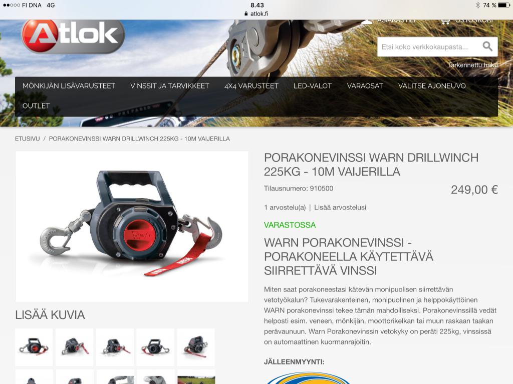 tommone käytössä.tautisen hyvä laite, tuo vetokyky on ihan paskaa. vetää todellisuudessa moninkerroin, niin että tuo 6mm vaijeri katkeaa helposti. eli mitään luistavaa kytkintä ei ole, vaan vetää helposti varomattomalla käytöllä varpin poikki. aivan loistava masiina, kevyt ja yhdellä 18v 3ah makitan akkkuporakoneella vinssaa ihan perkeleesti. ei sillä mitään akseleita myöten uponnutta maasturia irrota, mutta uskon että todellinen betokyky on 2-3tonnia,pylpyrän kanssa varmasti on. mutta esim pakettiauto tulee trailerille missä ei kippiä ja aika lyhkäset ajosillat, ihan kun tyhjää vaan.ei ees huokase masiina viellä.
