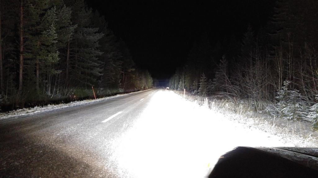 Asiasta takaisin aiheeseen. Mainitsin aiemmin Walonia Horizon paneelista (sama kuin Optibeam Commander), ja liitteenä nyt kuva ko. valaisimesta hiluksin keulalla H4 led-polttimoiden kaverina, 'mäen' päälle on matkaa hieman yli viisisataa metriä.