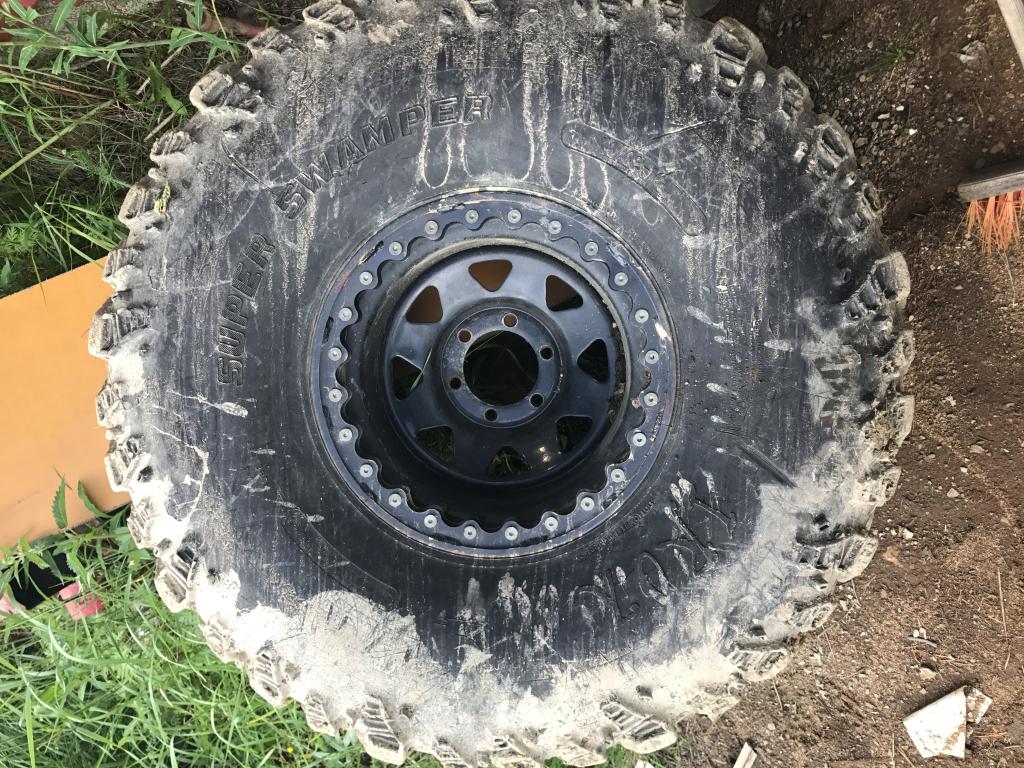 14/42-16LT, pintaa on ja tasaisesti kuluneet. Pitää ilmat, ajettu metsässä ja käytönkin jälkiä on, mutta ei mitään vakavaa. Vanteet beadlockit, 6x139,7, Toyotassa olleet 61:sen akseleitten kaverina, leveys ja et ei tiedossa, mutta jos pitää veikata niin tehty 10” -44et vanteista.