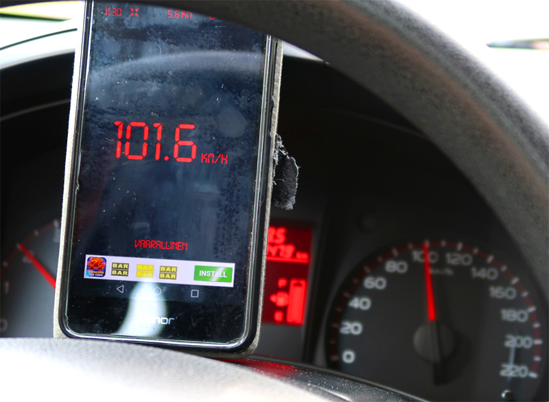 Metkosta takaisinpäin ajellessa oli aikaa kuvailla kun oli vaimo ja älypuhelin mukana. Mittari heitti sen verran kuin kuvittelinkin eli aika oikein näyttää. Kuvissa neula tasan 80:ssä ja satkussa. Vitonen on vaihteena ja renkaina 235/85-16. Auton vuosimalli 2014.