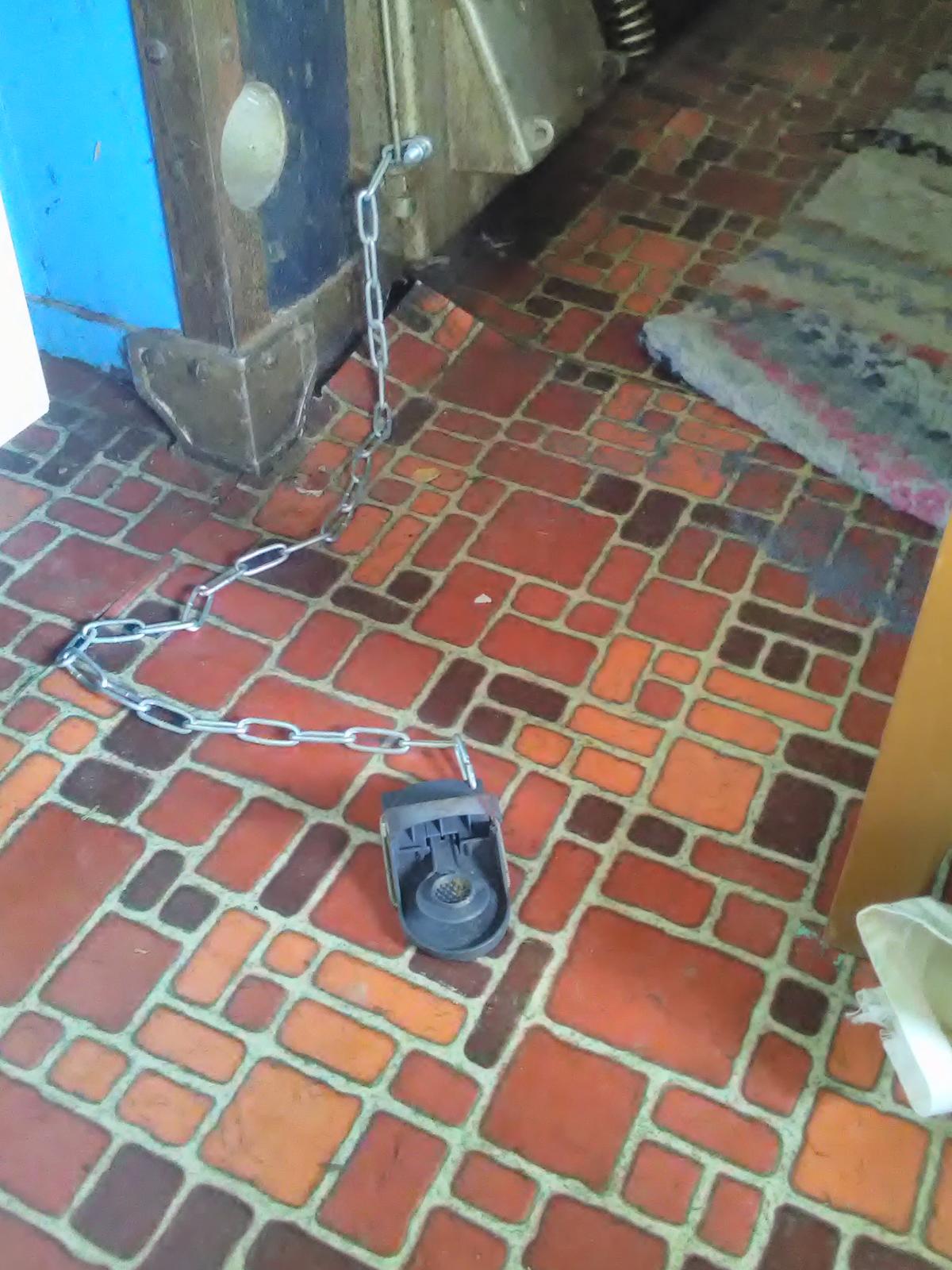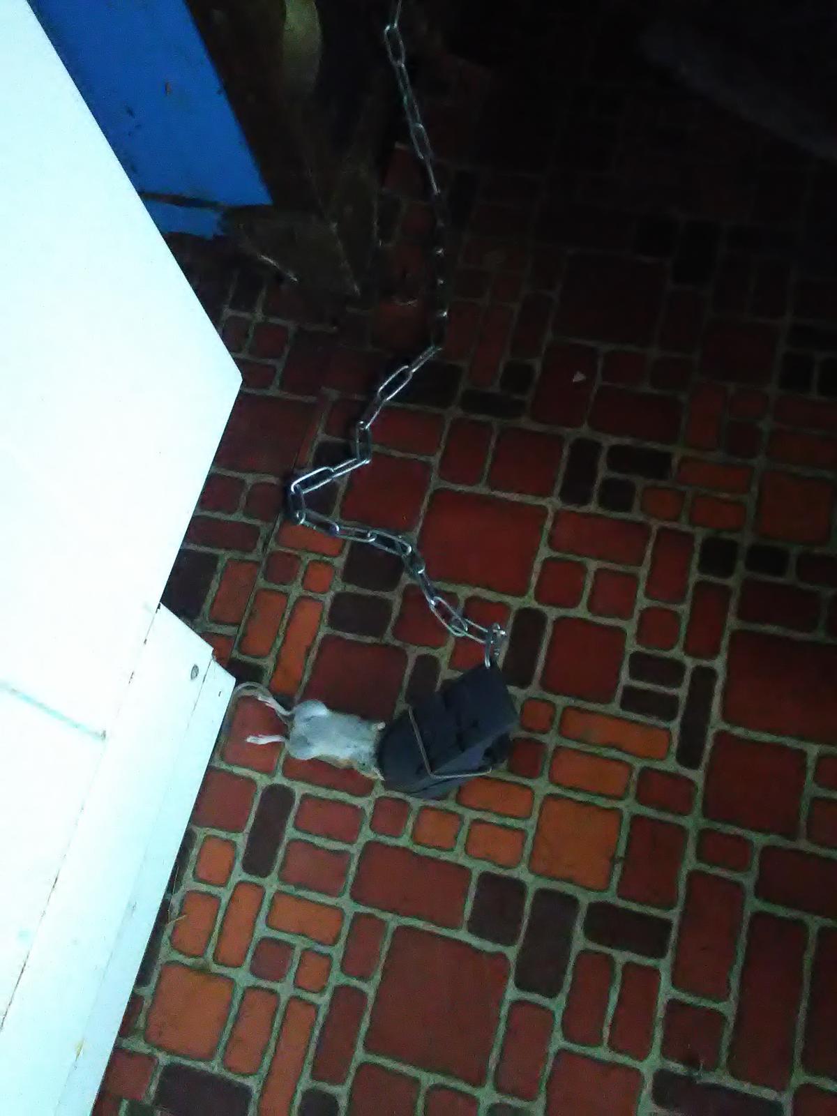 Tänä syksynä etsin yläkerran loukkua. Se löytyi suht nopeasti muutaman metrin päästä. Mutta hiiri oli melko kova jätkä, loukku osunut keskelle päätä, ja silti oli ruopinut eteenpäin. Siitä se idea sitten lähti... Loukku ketjulla kiinni puuhellaan. Parin päivän päästä tuli tulosta, eikä tarvinnut loukkua etsiä. Häh hää!