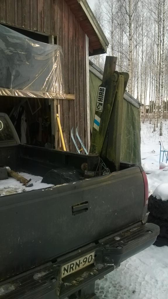 Vinssi vetää melko hyvin ja väkipyörän kautta kun vaijerin kiinnittää alalevyyn niin voima tuplaantuu. Vetopiste siirtyy samalla alemmas. Eihän tuossa ohjaustehostimessa paineita ole kuin 60 bar. Ja voihan piukan paikan tullen vinssiä ajaa nosturin hydrauliyksikön kautta(170 bar). Nosturin käännöstä tuli vähän hidas mutta ainakin jaksaa kääntää vaikka auto olisi kallellaan