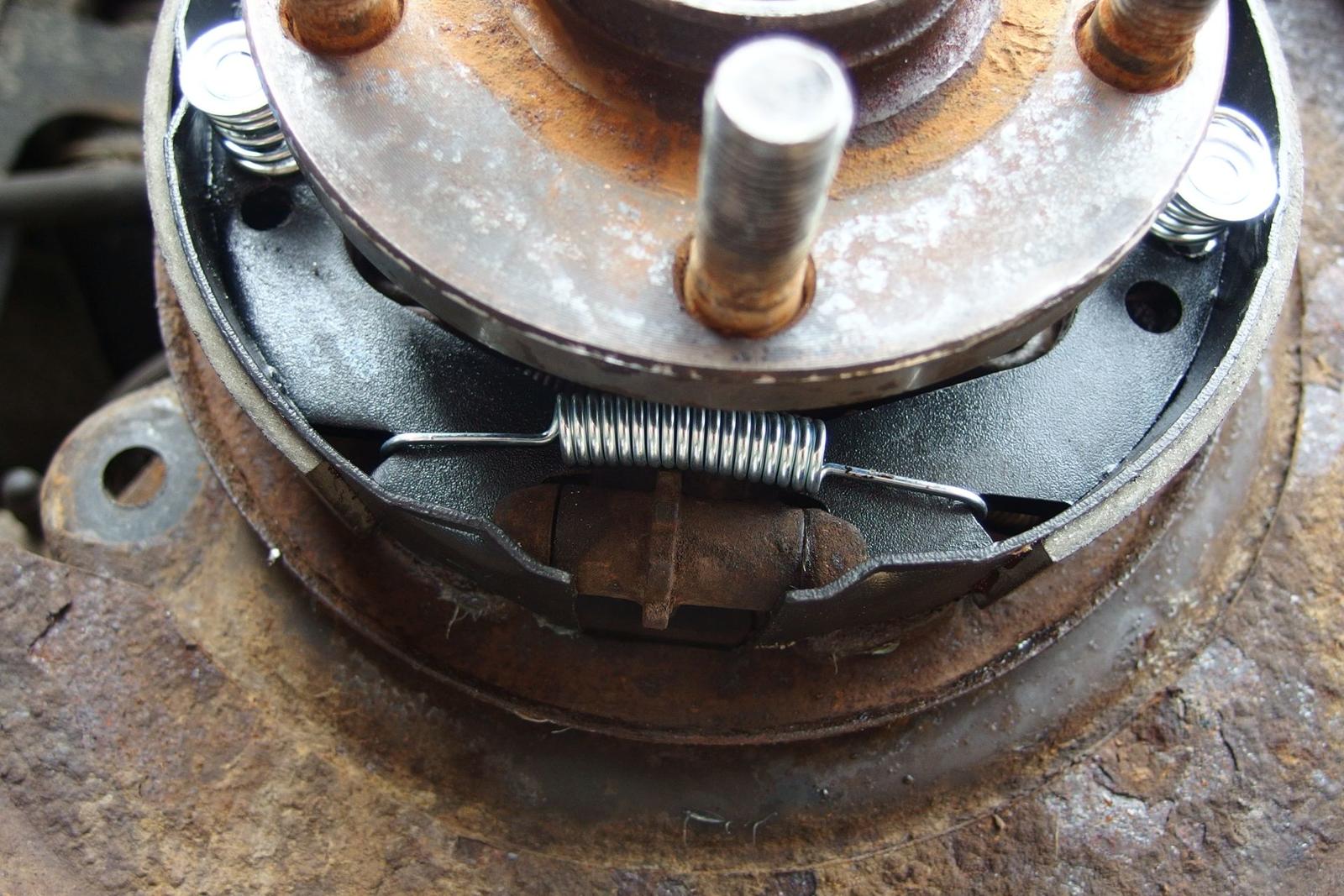 Alkoi olla aika uusia kässärin jarrukengät. Ei mennyt ihan "heittämällä" paikoilleen. Kuvista näkyy, että tappi johon kiristin laakeroidaan, on liian lyhyt ja jousien, jotka pitää kengät jarrukilpeä vasten, reikä on väärässä paikassa.