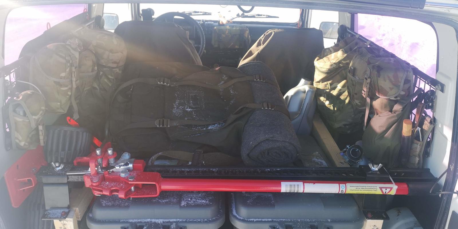 Autossa on myös kattava määrä radioita ja piiskoja: LA-puhelin, APRS-lähetin ja vhf/uhf radio. Mukana tulee myös pakolliset leirikamat, vaelluskota, kamiina ja työkalut. Kuvassa vielä talvinakit päällä, uudenkarheat mutakumit sekä raptorin 2.5" korotussarja odottelee kesän tuloa tänne peräpohjolaan.