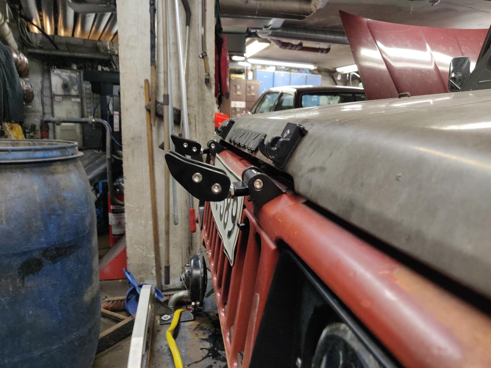 Tai en varsinaisesti tutkinut sen kummemmin, ruuvasin uuden 70A laturin kiinni ja suoritin hihnaistamisen tällä kertaa 4-rivisellä moniurahihnalla kuten kuuluu. Lisäksi hanskalokerossa on nyt toinen hihna varalla. Oppiva otus tämä Suzukisti, eikö? ![]() GTI:n villihevoset ovat arvaamattomia ja kaikkeen on varauduttava. Suzuki-tapahtumassa suoritetun teollisuusvakoilun perusteella sammuttimelle toimivan oloinen paikka on kuljettajan penkin etureunan kohdalla. Penkki pääsee hyvin liikkumaan tämän ohi. Kumiset konepellin kiinniripustimet sai väistyä, kun täysamuliinista kiinalaisten muotoilemat käikäleet löysivät paikkansa. Joku Jeep-bolt-on osa tämä oli, mutta näytti riittävän sinneppäin sopivalta, että tilasin parin. Aika se näyttää näidenkin kestävyyden. Eipähän pelti pompi silmille enään... Ajatuksena on, että tälläkin joskus uskaltaisi jollekin reissulle lähteä, niin pitäähän sitä länkky saada kiinni. Vääntelin asennuspellin 3mm levystä ja ihan hyvin se sinne näyttäisi istuvan ![]()
